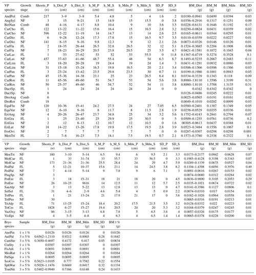Table A1Distribution (Dist), mean (M), median (Mdn), and standard deviation (SD) of the heights (h) and dry biomass (BM) of vascular plant (VP) and bryophyte (Bryo) species identified from the 36 study plots (P) in July 2022. The number of VPs within the studied area was counted by the number of shoots (Shoots_P). BMs are reported only for samples (S) collected for BM estimations. Separate samples were collected for plants in different growth stages: flowering (FL) and non-flowering (NF) VP species, except for four species for which these categories were combined (Comb). The sample size (Sample) of bryophytes depended on the commonness of the species and was either 1 % or 5 % of the studied area. For all Bryo species, a BM for 1 % coverage of the studied area was calculated (BM 1 %). Abbreviations for the plant species: Andromeda polifolia (AndPol), Angelica sylvestris (AngSyl), Betula nana (BetNan), Carex chordorrhiza (CarCho), Carex dioica (CarDio), Carex flava (CarFla), Carex lasiocarpa (CarLas), Carex limosa (CarLim), Carex panicea (CarPan), Carex rostrata (CarRos), Dactylorhiza species (DactSp.), Drosera anglica (DroAng), Drosera rotundifolia (DroRot), Equisetum fluviatile (EquFlu), Equisetum variegatum (EquVar), Eriophorum angustifolium (EriAng), Eriophorum gracile (EriGra), Eriophorum latifolium (EriLat), Festuca ovina (FesOvi), Menyanthes trifoliata (MenTri), Molinia caerulea (MolCae), Pedicularis palustris (PedPal), Pinguicula species (PingSp.), Potentilla erecta (PotEre), Saussurea alpina (SauAlp), Selaginella selaginoides (SelSel), Tofieldia pusilla (TofPus), Trichophorum alpinum (TriAlp), Trichophorum cespitosum (TriCes), Vaccinium oxycoccos (VacOxy), Viola epipsila (VioEpi), Aneura pinguis (AnePin), Aulacomnium palustre (AulPal), Campylium stellatum (CamSte), Cinclidium stygium (CinSty), Fissidens adianthoides (FisAdi), Mesoptychia rutheana (MesRut), Paludella squarrosa (PalSqu), Scorpidium cossonii (ScoCos), Sphagnum warnstorfii (SphWar), and Tomentypnum nitens (TomNit). Plot-scale vegetation data can be obtained from the corresponding author.
