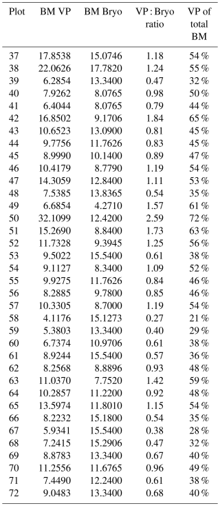 Table A2Total plot-scale dry mass weight biomass (BM) of vascular plants (VP) and bryophytes (Bryo) in grams inside the collar (A=660.5 cm2) at each experimental plot (37–72), a VP to Bryo BM ratio (VP : Bryo ratio), and the portion of VP BM in the total BM (VP of total BM).