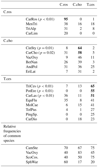 Table B1Indicator values (% of perfect indication, based on combining the values of relative abundance and relative frequency) of all identified species (n=40) of Puukkosuo segregated by the vascular plant clusters. The values for the clusters' significant indicator species are bolded. Species with an indicator value lower than 20 % were excluded from the table. Abbreviations for the species most strongly connected to the clusters: C.ros = C. rostrata, C.cho = C. chordorrhiza, and T.ces = C. lasiocarpa, P. erecta, and T. cespitosum. Abbreviations for the species: CarRos = Carex rostrata, MenTri = Menyanthes trifoliata, TriAlp = Trichophorum alpinum, CarLim = Carex limosa, CinSty = Cinclidium stygium, CarCho = Carex chordorrhiza, VacOxy = Vaccinium oxycoccos, BetNan = Betula nana, AndPol = Andromeda polifolia, EriLat = Eriophorum latifolium, TriCes = Trichophorum cespitosum, PotEre = Potentilla erecta, CarLas = Carex lasiocarpa, EquFlu = Equisetum fluviatile, MolCae = Molinia caerulea, TofPus = Tofieldia pusilla, PingSp. = Pinguicula sp., CarDio = Carex dioica, CamSte = Campylium stellatum, ScoCos = Scorpidium cossonii, and SphWar = Sphagnum warnstorfii.
