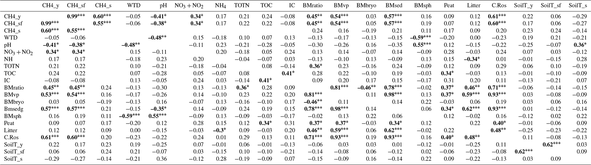 Table B2Pearson's correlation matrix among the environmental and biomass variables. Significant correlations are bolded, p-value ≤ 0.05 (r≥0.33) marked with one asterisk (*), p-value ≤ 0.01 (r≥0.42) with two asterisks () and p-value ≤ 0.001 (r≥0.53) with three asterisks (). CH4_y = year-round methane flux, CH4_sf = snow-free season methane flux, CH4_s = snow season methane flux, WTD = water table depth, NO3 + NO2 = nitrate and nitrite, NH4 = ammonium, TOTN = total nitrogen, TOC = total organic carbon, IC = inorganic carbon, BMratio = vascular plant to bryophyte biomass ratio, BMvp = vascular plant biomass, BMbryo = bryophyte biomass, BMsed = biomass of all sedges, BMsph = biomass of Sphagnum mosses, Peat = peat layer thickness, Litter = litter percentage, CarRos = biomass of Carex rostrata, SoilT_y = average year-round soil temperature at −5 cm, SoilT_sf = average snow-free season soil temperature at −5 cm, and SoilT_s = average snow season soil temperature at −5 cm. WTD and porewater chemistry concentrations are values of the snow-free season.