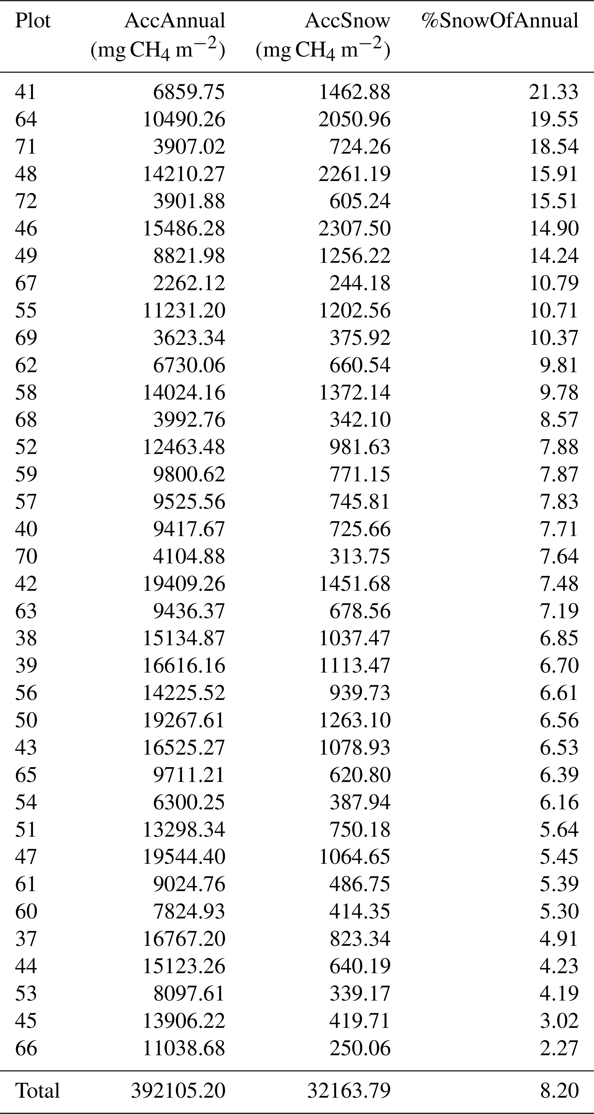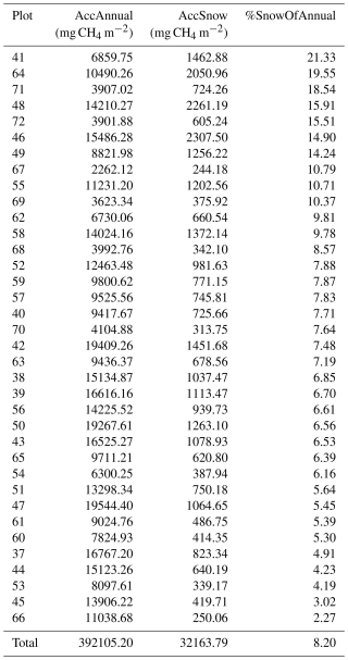 Table B3Accumulated annual (1 November 2021–31 October 2022, AccAnnual) and snow season (1 November 2021–12 May 2022 and 27–31 October 2022, AccSnow) methane flux rates in mg CH4 m−2 and the portion of snow season fluxes in the annual flux (%SnowOfAnnual) calculated for each plot from the manual static chamber measurements. Ordered by the highest portion of the annual flux.