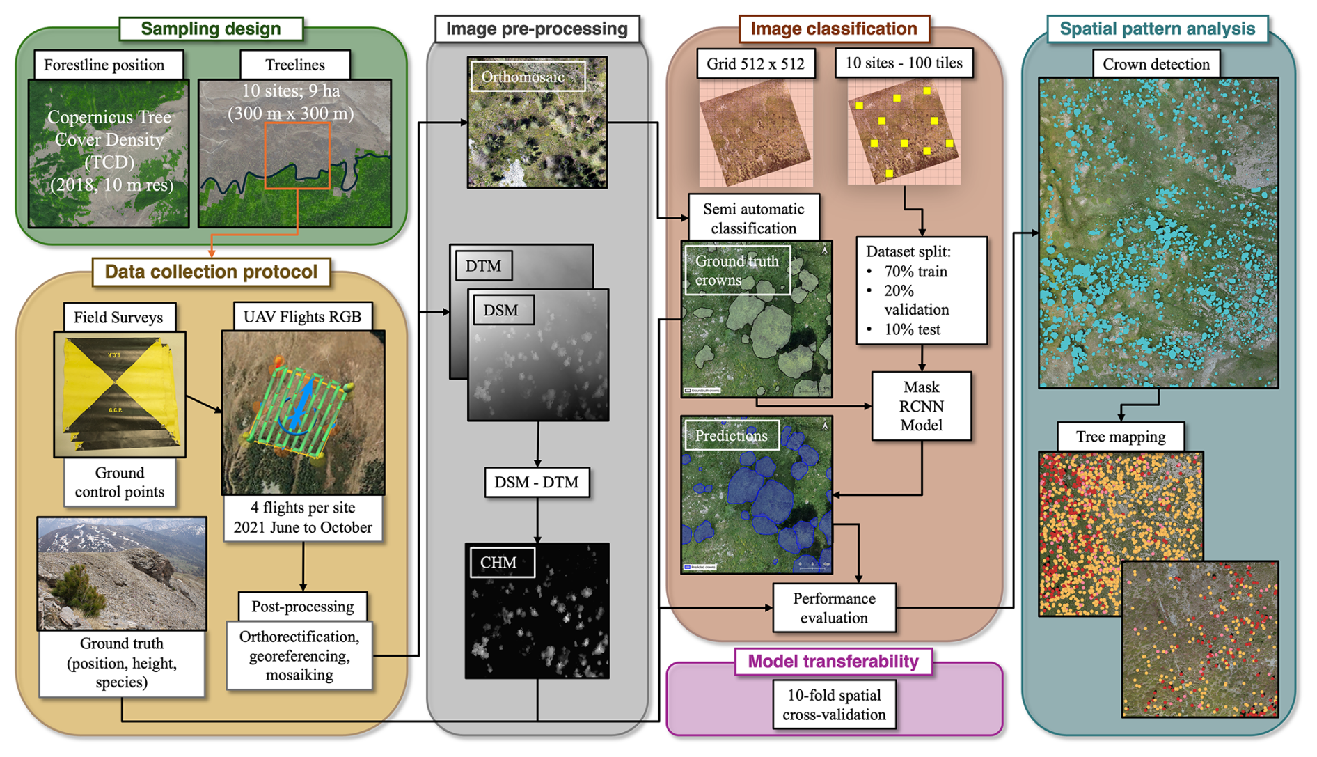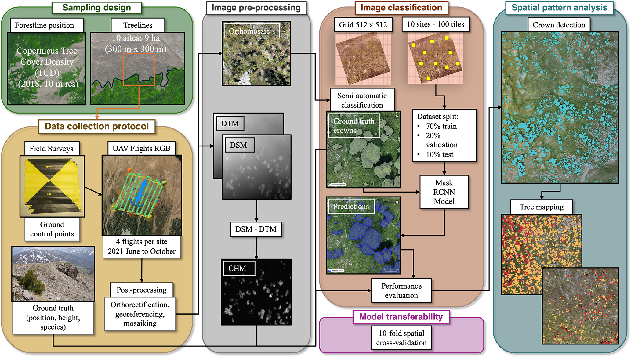 Our results demonstrated that the proposed methodology effectively detects, delineates, georeferences, and measures the height of most trees across diverse Alpine treeline ecotones. The proposed methodology enables the analysis of fine-scale patterns in order to achieve an interpretation of underlying ecological processes over large ecotonal extents. The inclusion of heterogeneous study areas facilitates the transferability of the segmentation model to other mountain regions and offers a benchmark for developing a global network of fine-scale mapped treeline spatial patterns, bearing a great potential in monitoring the effects of global change on ecotone dynamics.
