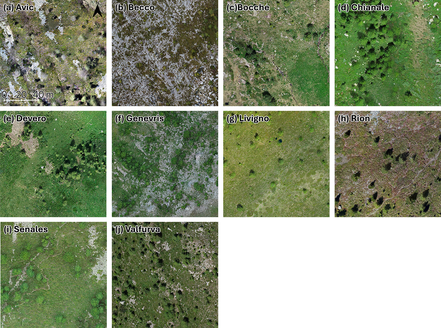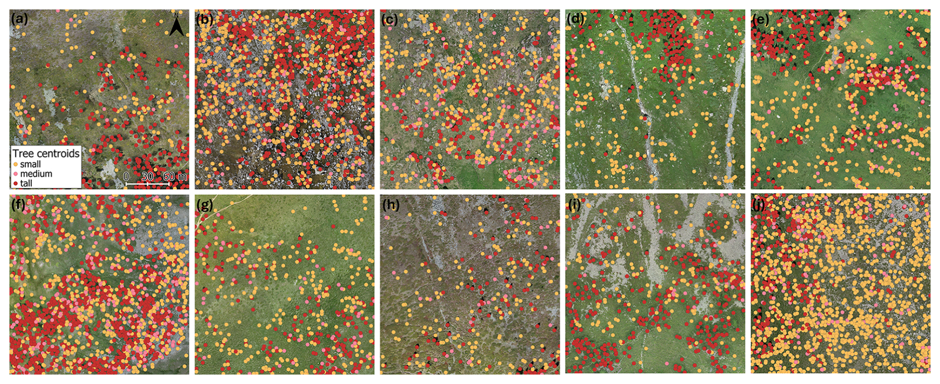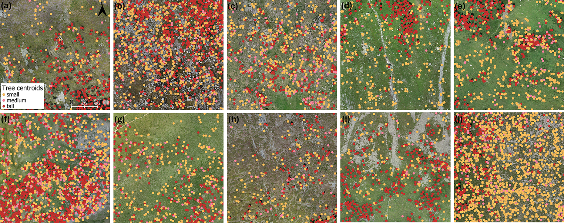 Figure 3Fine-scale stem-mapped treeline ecotones overlapped with the 9 ha orthophoto as a background image (a) Avic, (b) Becco, (c) Bocche, (d) Chianale, (e) Devero, (f) Genevris, (g) Livigno, (h) Rion, (i) Senales and (j) Valfurva. Trees belonging to the small, medium, and tall tree-height classes (Small:  130 cm; Medium: > 130 cm and <= 200 cm; Tall: > 200 cm) are in orange, pink, and red, respectively.