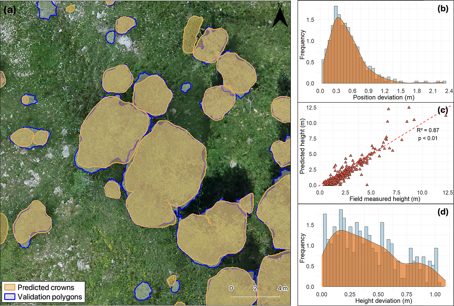 Figure 4(a) Instance segmentation output with a comparison of crowns predicted by the model (shaded with orange outline) and validation polygons (shaded with blue outline) in Genevris study site. The image illustrates how smaller trees were harder to detect by the model, with some missing segmentations. Frequency and smoothed kernel density distribution of (b) relative deviation for position estimation and (d) deviation for height estimations with the smoothed, continuous approximation of the kernel-density estimate in orange. (c) Linear regression model between the field-measured crown heights and estimated heights in metres. The red dashed line represents the 1:1 line.