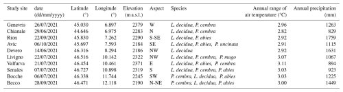 We selected ten study sites across the Italian Alps (Fig. 1) spanning a broad longitudinal gradient representative of the Western, Central, and Eastern Italian Alps. This selection ensured a balanced dataset encompassing highly heterogeneous climatic, topographical, soil, and vegetational conditions (Appendix A). Introducing such heterogeneity allowed us to test the transferability of the protocol to several treeline conditions. The selected treelines present elevations ranging between 2100 and 2400 m a.s.l., and variable slope aspects due to the differing orientations of the valleys. Above the closed forest there are both mesic and xeric regions and feature patches of grasslands, sparsely vegetated areas, screes, and surfaces shaped by gravitational events such as rill and gullies. All the selected landscapes experienced centuries of human land-use practices under varying intensities of management pressure. In general, land abandonment is more marked in the Western sector of the study area (Bätzing et al., 1996). Across all sites, the annual range of air temperature ranges between 2.8 and 3.1 °C, while the mean annual precipitation varies from 800 to 1800 mm. Reflecting the typical species composition of the subalpine belt in the Alps, in all the studied treelines the dominant treeline-forming species are European larch (Larix decidua Mill.) and Swiss stone pine (Pinus cembra L.). Other species present include Norway spruce (Picea abies (L.) H.Karst.), dwarf mountain pine (Pinus mugo Turra), mountain pine (Pinus uncinata Miller), Scots pine (Pinus sylvestris L.), as well as few broadleaf species such as green alder (Alnus viridis (Ehrh.) K. Koch) and silver birch (Betula pendula Roth). Further details on the study sites are provided in Table 1.