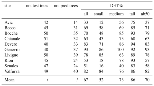 Table 2Single site detection rates and number of total predicted trees (no. pred trees) out of the totality of trees sampled in the field (no. test trees). DET % all = detection rate on the totality of individuals; DET % small = detection rate on small trees; DET % medium = detection rate on medium trees; DET % tall= detection rate on tall trees; DET % ab50 = detection rate on individuals taller than 50 cm.
