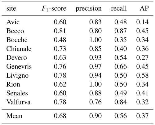 During training we used the Adam optimizer with a learning rate of 0.00025, 128 ROIs per image, 1500 epochs, and a batch size of 30. We used the R101-FPN configuration as it offers a good balance between training speed and segmentation accuracy (https://github.com/facebookresearch/detectron2/blob/main/MODEL_ZOO.md, last access: 16 July 2024). To prevent overfitting, we monitored the validation loss in the F1-score every 100 iterations and implemented early stopping if the F1-score declined for more than five evaluations. The model was trained with data augmentation consisting in random resizing and rotation of the input images.