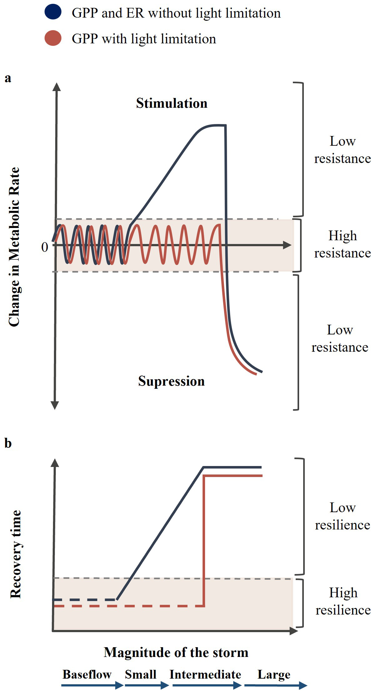 The role of storm events as drivers of metabolic stimulation or suppression can be described in terms of the resistance and resilience of stream ecosystems to hydrological disturbances. The resistance to a hydrological disturbance can be defined as the ability of stream ecosystems to uphold metabolic rates unchanged relative to base flow conditions despite increases in discharge. Hence, either the stimulation or suppression of metabolic activity during storms indicates low resistance to storm perturbations (i.e., Roberts et al., 2007; Uehlinger, 2000; O'Donnell and Hotchkiss, 2022). In turn, the resilience of stream metabolic activity to hydrological events is defined by the time required for either GPP or ER to return to values comparable to those prior to the storm event (Carpenter et al., 1992; O'Donnell and Hotchkiss, 2022). Streams with high resilience are those for which metabolic rates quickly recover prior values after the storm event. The duration of this recovery can vary depending on the magnitude of the disturbance, as well as across seasons and on environmental conditions such as light availability and temperature (Roberts et al., 2007; Lowman et al., 2024).