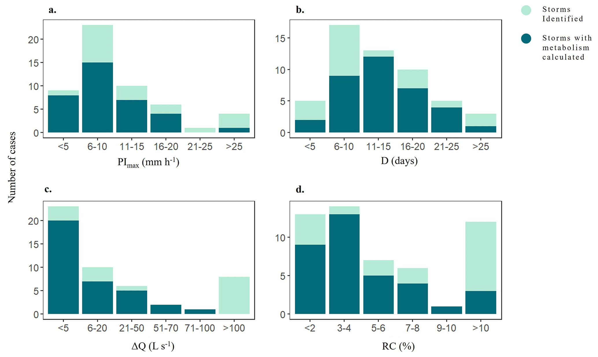 Figure 3Histograms showing the distribution of (a) maximum precipitation intensity (PImax) (b) duration of storm event (D), (c) change in discharge (ΔQ), and (d) runoff coefficient (RC) for the 53 identified storm events (light and dark blue) as well as for the 35 events for which we could calculate metabolic rates (dark blue).