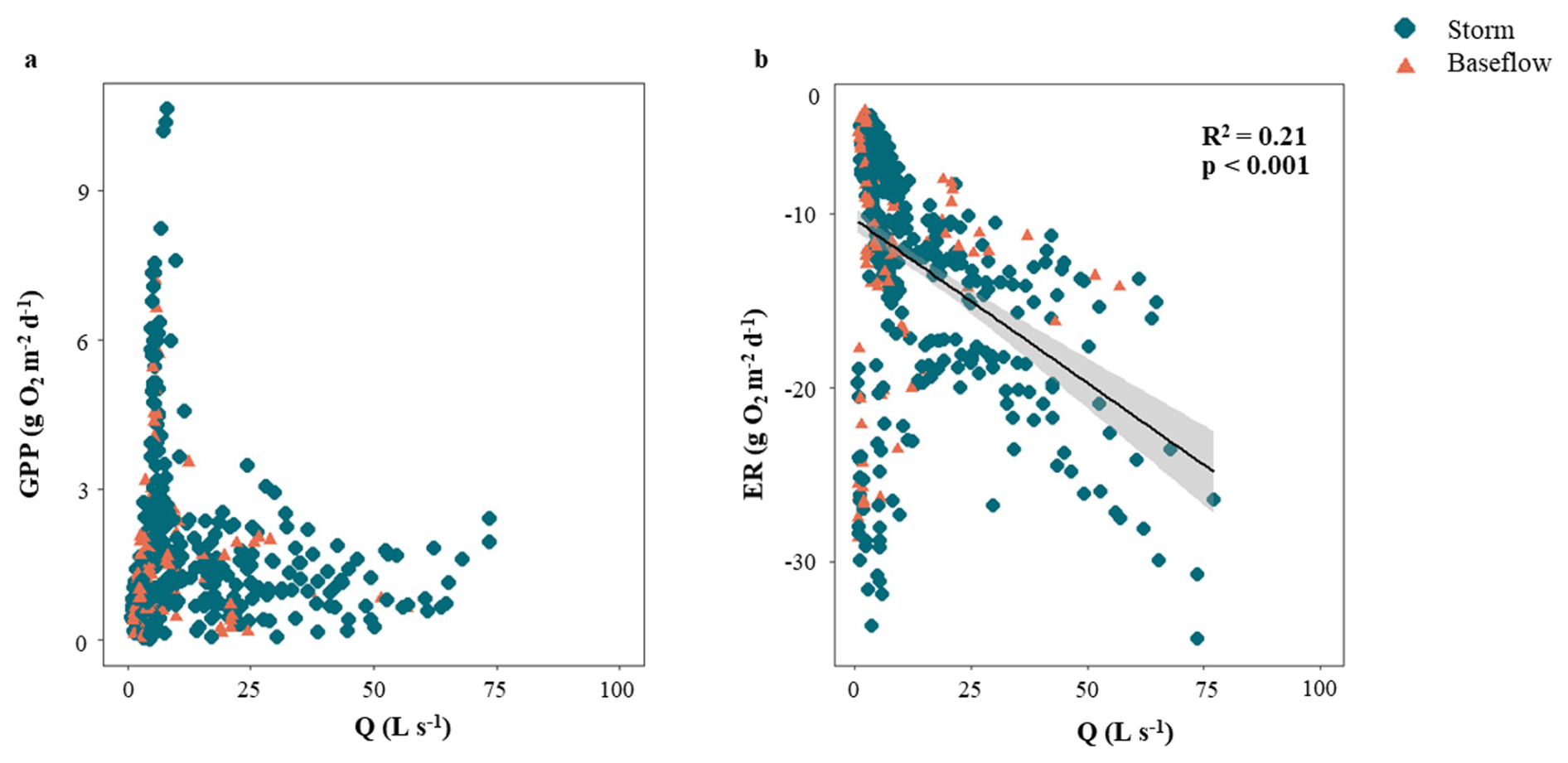 Figure 4Relationship between mean daily discharge (Q) and daily (a) gross primary production (GPP) and (b) ecosystem respiration (ER) across all individual storm events (in blue) and for the days 1 to 6 prior to each event (orange). The black line represents the linear regression between variables (only shown when p < 0.01) and the shaded area indicates the 95 % confidence interval. Note that regressions were based only on storm event days.
