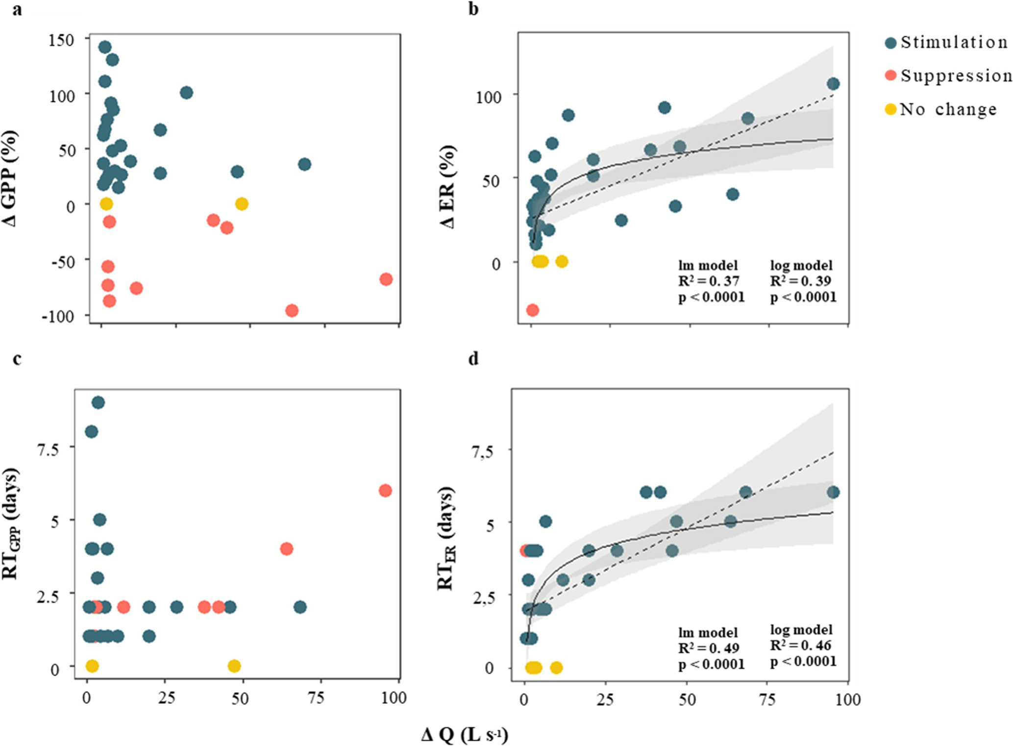 Figure 5Relationship between changes in discharge (ΔQ, defined as the difference between peak flow and baseflow) and stream metabolic responses. Panels (a) and (b) show the change in gross primary production (ΔGPP) and ecosystem respiration (ΔER), respectively, used as proxies for metabolic resistance. Panels (c) and (d) show recovery time for GPP (RTGPP) and ER (RTER), used as proxies for metabolic resilience. Colour coding indicates whether metabolic activity was stimulated (blue), suppressed (red), or showed no significant change (yellow) in response to the storm event. Solid and dashed lines represent the best-fit models, only when statistically significant (p < 0.01) and the shaded area indicates the 95 % confidence interval. For panels (b) and (d), there were no differences in the goodness of fit between the logarithmic (log) and linear (lm) models (Table S4).
