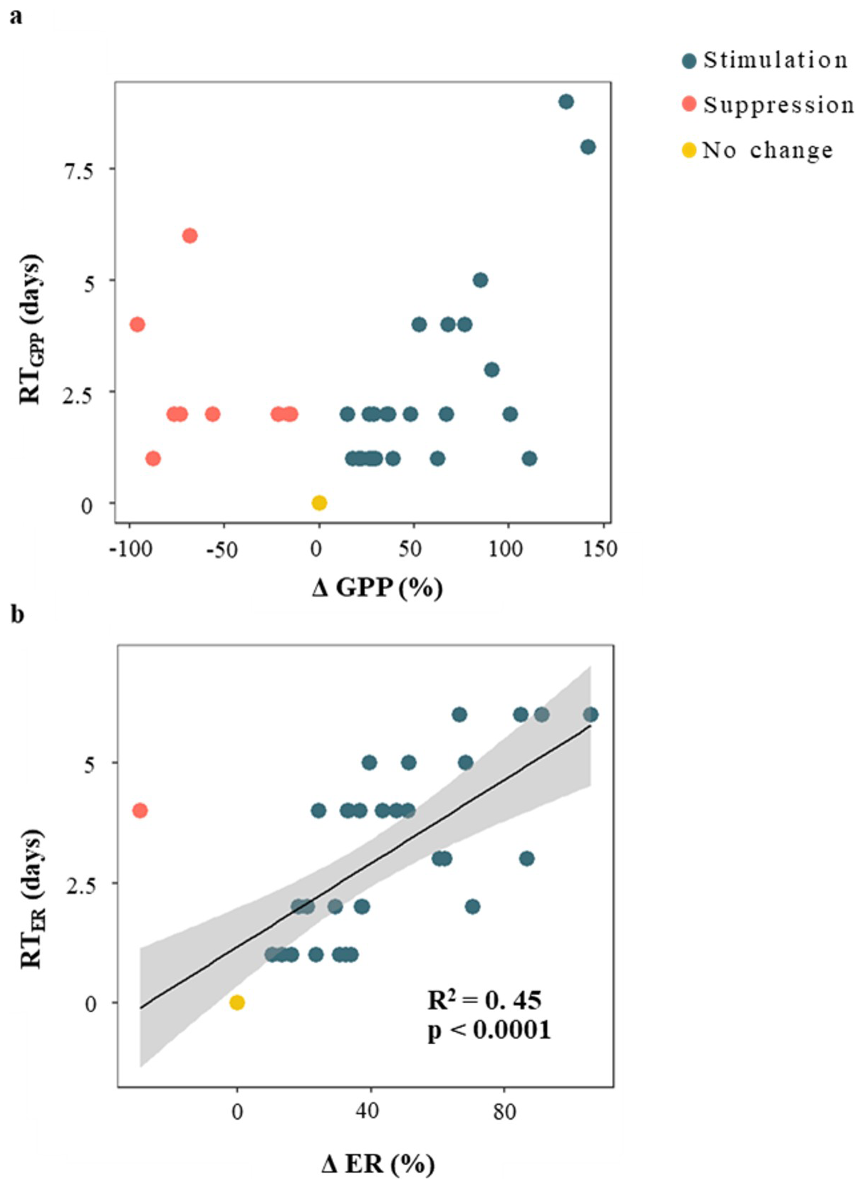 Figure 6Relationship between resistance and resilience of gross primary production (GPP) and (b) ecosystem respiration (ER) during storm events. Resistance is the relative change in metabolic rates compared to prior baseflow conditions (i.e., ΔGPP and ΔER). Resilience is the recovery time of metabolic rates to prior conditions (i.e., RTGPP and RTER). Colour coding indicates whether metabolic activity was stimulated (blue), suppressed (red), or showed no significant change (yellow) in response to the storm event. The black line represents the linear regression between variables (only shown when p < 0.01) and the shaded area indicates the 95 % confidence interval.