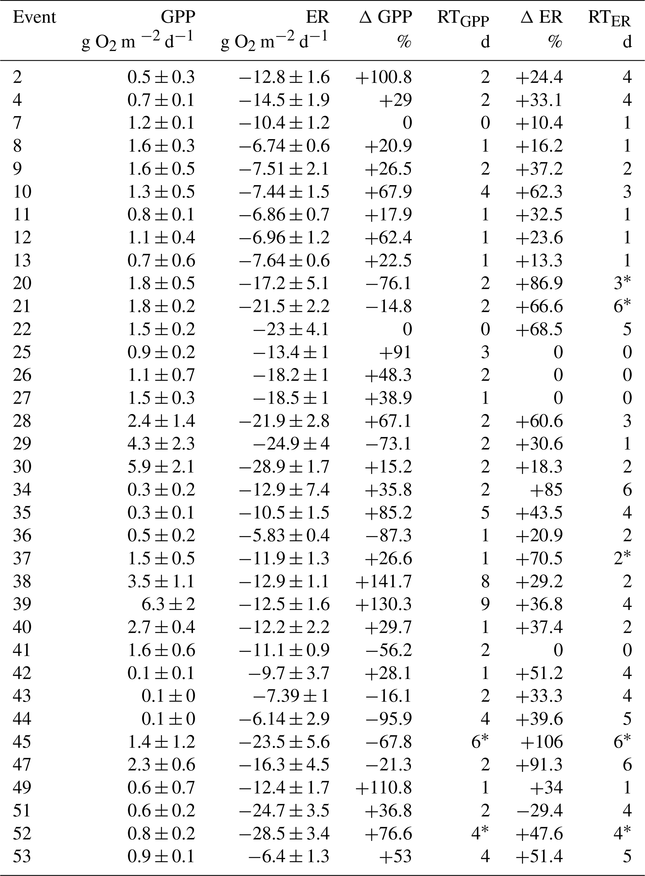 Table 1Metabolic rates, resistance, and resilience of gross primary productivity (GPP) and ecosystem respiration (ER) for each storm event. GPP and ER rates are expressed as mean ± SD Resistance is expressed as the maximum percentage of change in metabolic rates relative to prior conditions (ΔGPP and ΔER). Zero values (i.e., no change) indicate changes smaller than 10 % and are interpreted as high resistance. Resilience is expressed as the time needed for GPP and ER to recover pre-event values (RTGPP and RTER). Asterisks indicate storm events for which recovery times were derived from linear regression overlapping with a consecutive event.