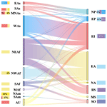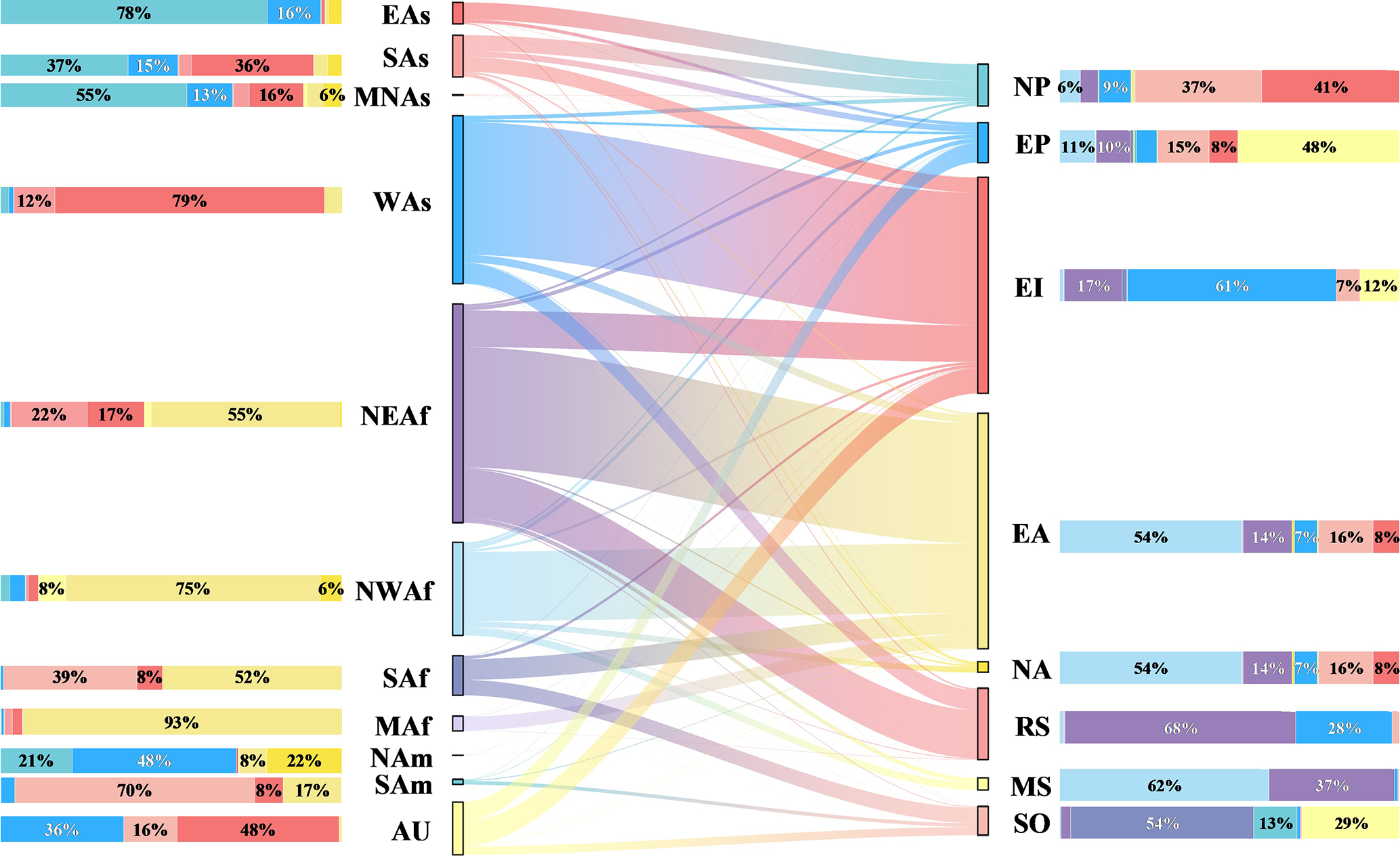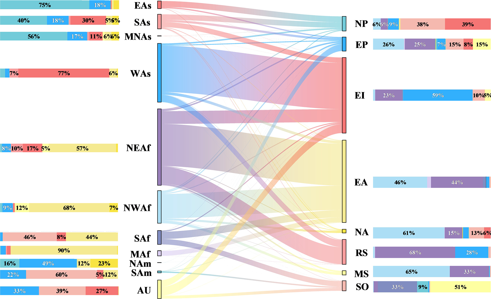 Figure 5The annual contributions of various dust source regions to oceanic dust deposition. Each column on the left represents the fraction of dust emitted from a given source region that is ultimately deposited in individual oceans, with different colors indicating the respective oceans. Each column on the right shows the contributions of various dust source regions to dust deposition over each ocean, with different colors corresponding to different dust source regions. The longitudinal columns depict the proportions of dust emission or deposition relative to global marine dust deposition. The lines in the middle illustrate the transport direction and intensity.