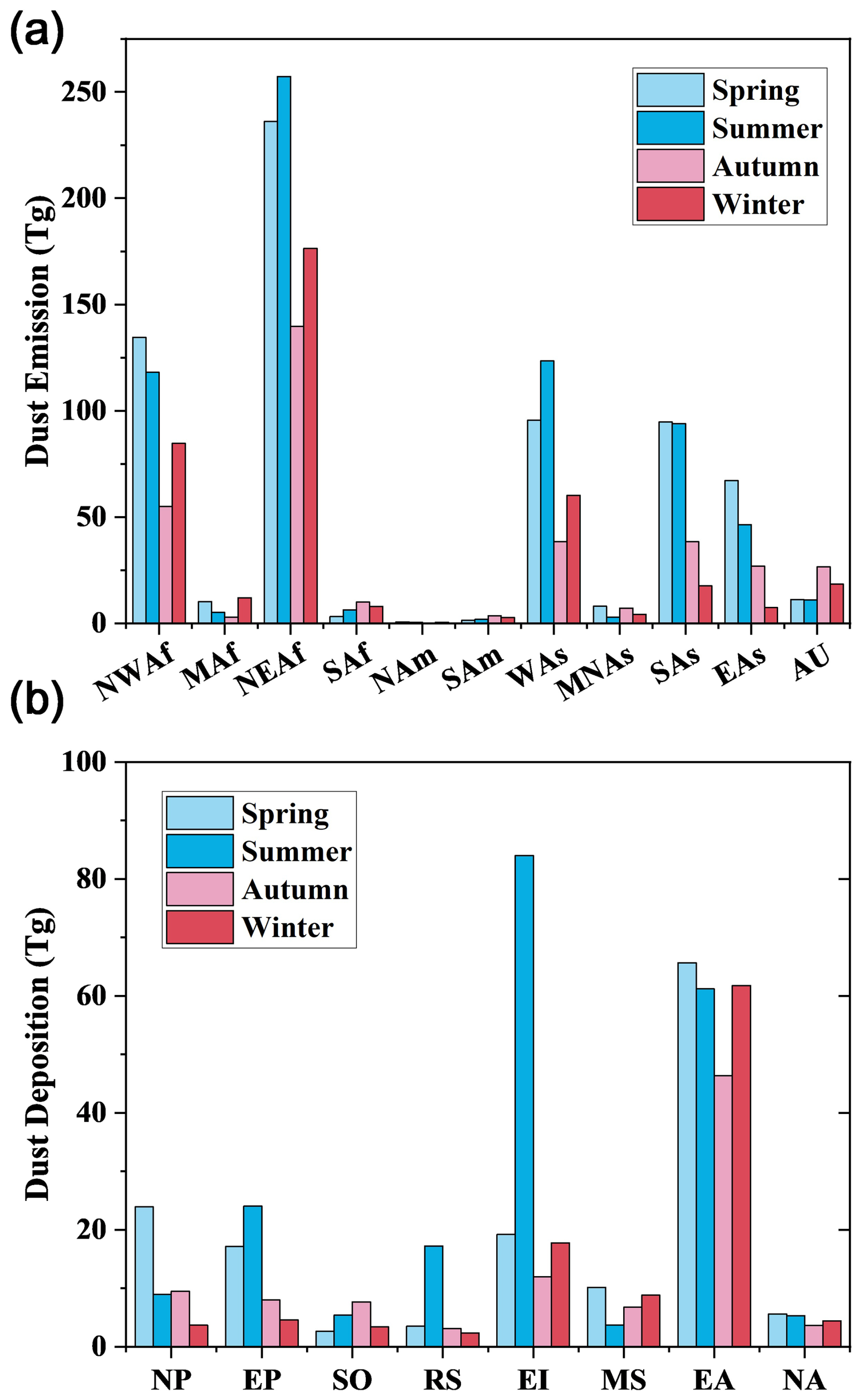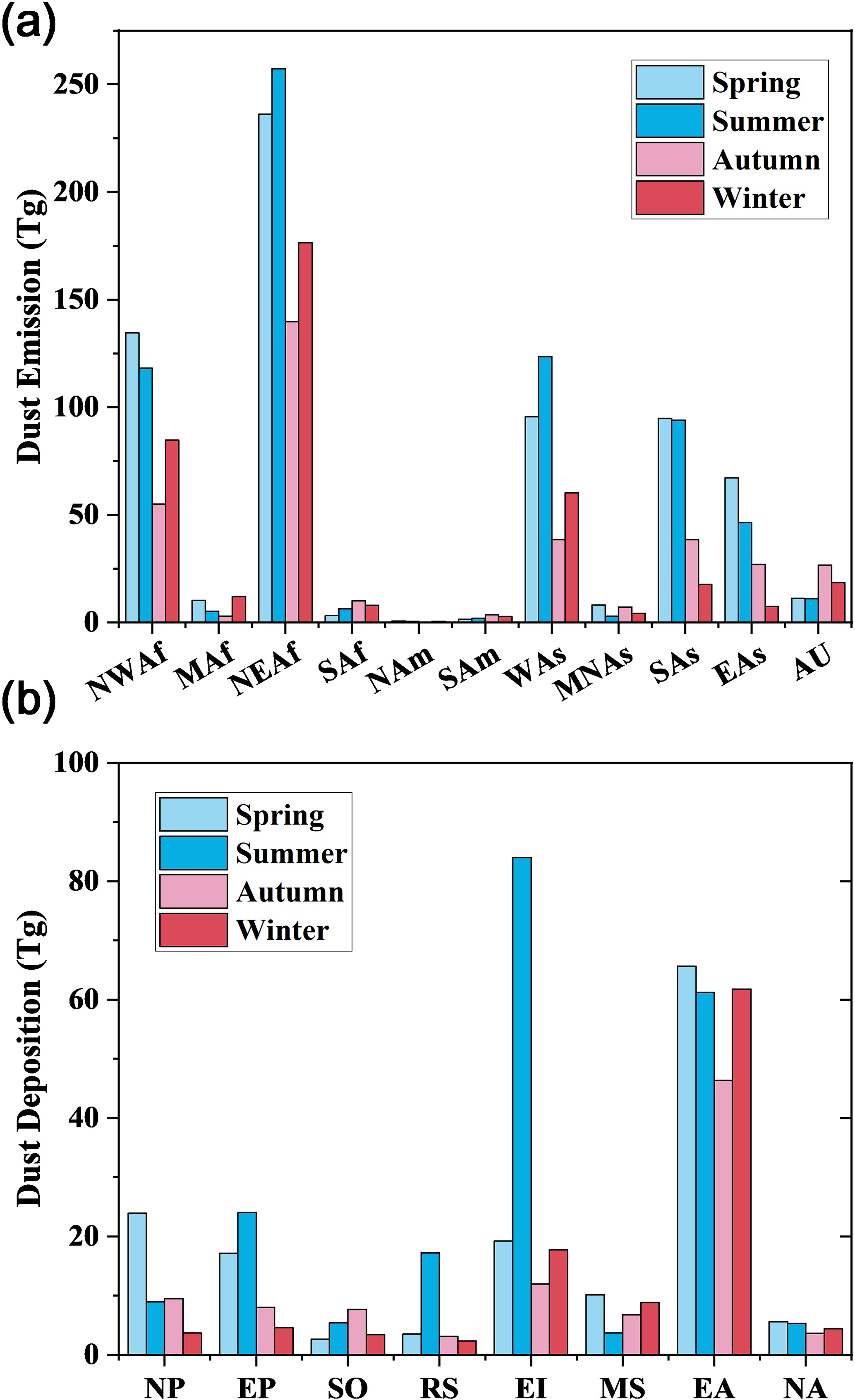 Figure 3The seasonal variations of (a) dust emission and (b) deposition in various dust sources