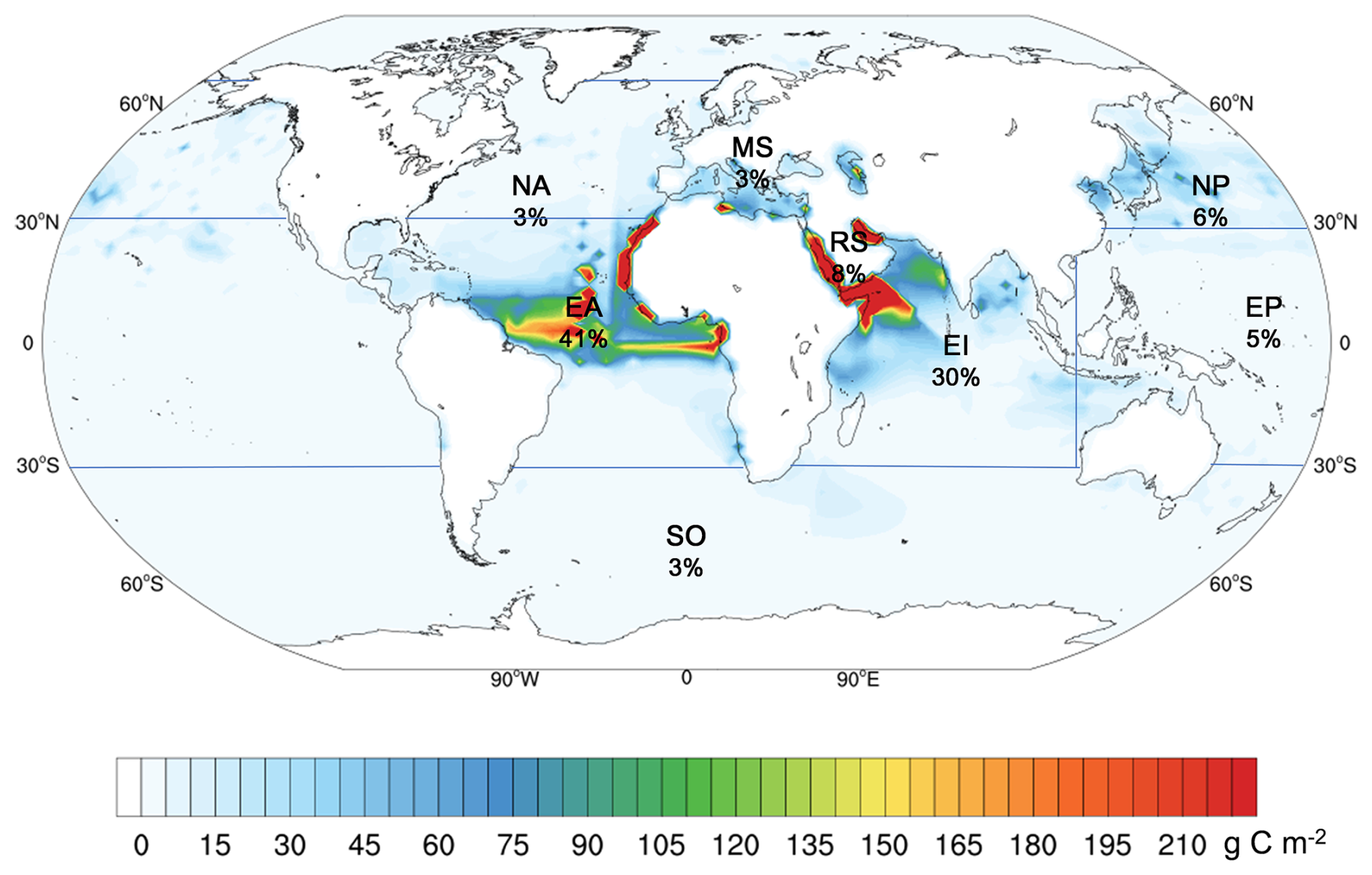 Figure 6The annual phytoplankton carbon uptake induced by dust deposition. Blue lines together with land-sea boundaries indicate different ocean regions. The percentages represent the proportion of annual dust-driven phytoplankton carbon uptake in each ocean to global ocean.