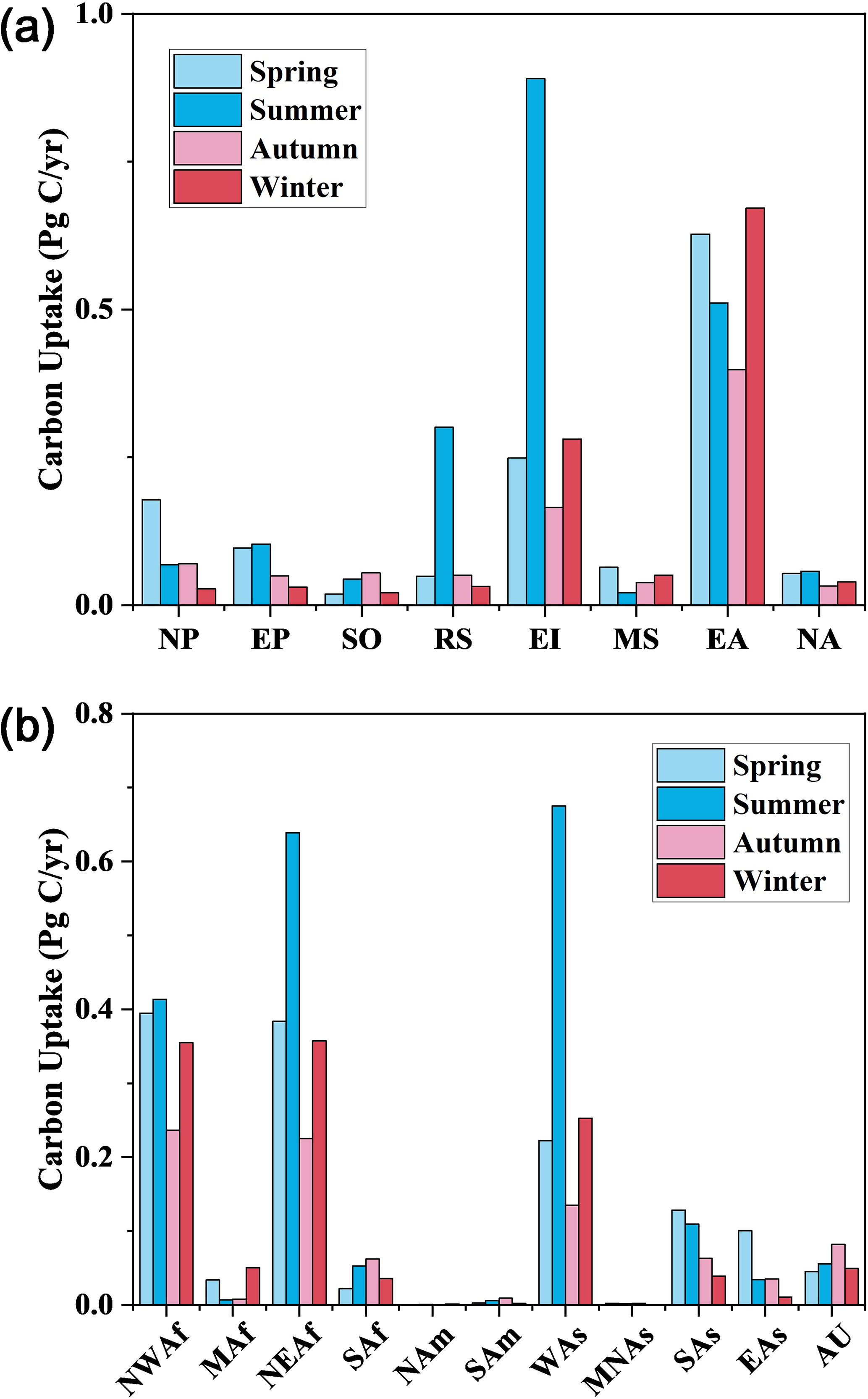 Dust from NEAf (1.7 Pg C yr−1), NWAf (1.5 Pg C yr−1), and WAs (1.3 Pg C yr−1) are the primary drivers of marine phytoplankton carbon uptake induced by dust deposition (Fig. 7). NEAf, NWAf and WAs make their largest contributions to marine phytoplankton carbon uptake during the summer, contributing 0.7, 0.4 and 0.7 Pg C yr−1, respectively (Fig. 7). They (NEAf, NWAf and WAs) all contribute least in autumn with contributions of 0.2, 0.2, and 0.1 Pg C yr−1, respectively (Fig. 7). Examining the seasonal variation in contributions from dust sources to global dust-driven carbon uptake of marine phytoplankton, contribution from EAs exhibits the largest seasonal variation. In spring, marine phytoplankton carbon uptake induced by dust from EAs is about ten times higher than in winter (Fig. 7). Dust from MAf and MNAs also shows a 5–6 fold difference in their contributions to global marine phytoplankton carbon uptake across different seasons, but their overall contributions remain only  2 % (Figs. 7 and 8).