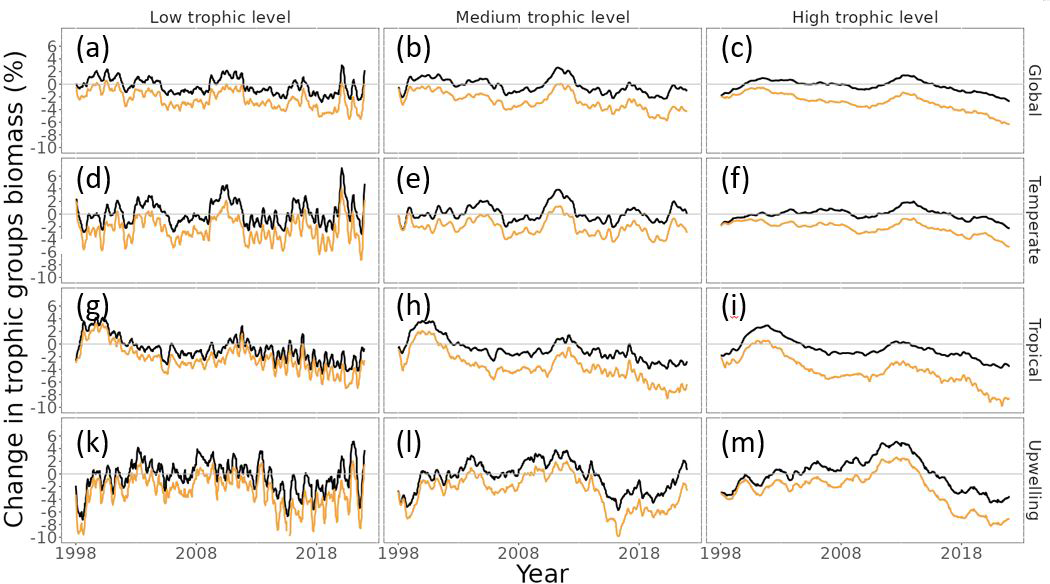 MHWs disrupt the metabolism of individuals and, on a larger scale, impact the entire ecosystem with trophodynamic changes throughout the trophic network (Fig. S9; Arimitsu et al., 2021; Collins et al., 2019; Gomes et al., 2024; Smith et al., 2023). However, due to their different physical characteristics depending on the ecosystems and the varying functioning of these ecosystems, they do not induce the same structural and functional changes, leading to different biomass losses. Tropical ecosystems are composed of species with low transfer efficiency (TE, low ratio between stored energy and ingested energy), with significant energy losses that increase with temperature (Brown et al., 2004; du Pontavice et al., 2020; Schramski et al., 2015). To compensate for this low efficiency, predation activity is high, resulting in rapid biomass transfers between prey and predators (biomass flow; du Pontavice et al., 2020). In these ecosystems, communities (which may be dominated by short-lived and fast-growing species) are generally living at the upper end of their thermal preferences (Begon and Townsend, 2021; Pinsky et al., 2019; Vinagre et al., 2016). They experience thermal stress associated with MHWs, leading to substantial mortality across the trophic network, with a higher proportion occurring in lower trophic levels regardless of the intensity of the MHWs as low TLs tend to have lower thermal limits than high TLs (Guibourd de Luzinais et al., 2024). MHWs scarcely affect transfer efficiency (TE), with an estimated average decrease of 0.05 % between 1998 and 2021 because the metabolism of species is already very high (du Pontavice et al., 2020). However, MHWs exacerbate prey mortality rates, resulting in proportionally higher predation rates, i.e. biomass remains for a shorter time at each trophic level, corresponding to an acceleration of biomass flow (estimated at 1 % on average between 1998 and 2021). Given the relatively high number of MHW days (Fig. 3; Hobday et al., 2018; Marin et al., 2021; Oliver et al., 2018), these modifications to biomass flow are “persistent” and involve significant biomass losses.