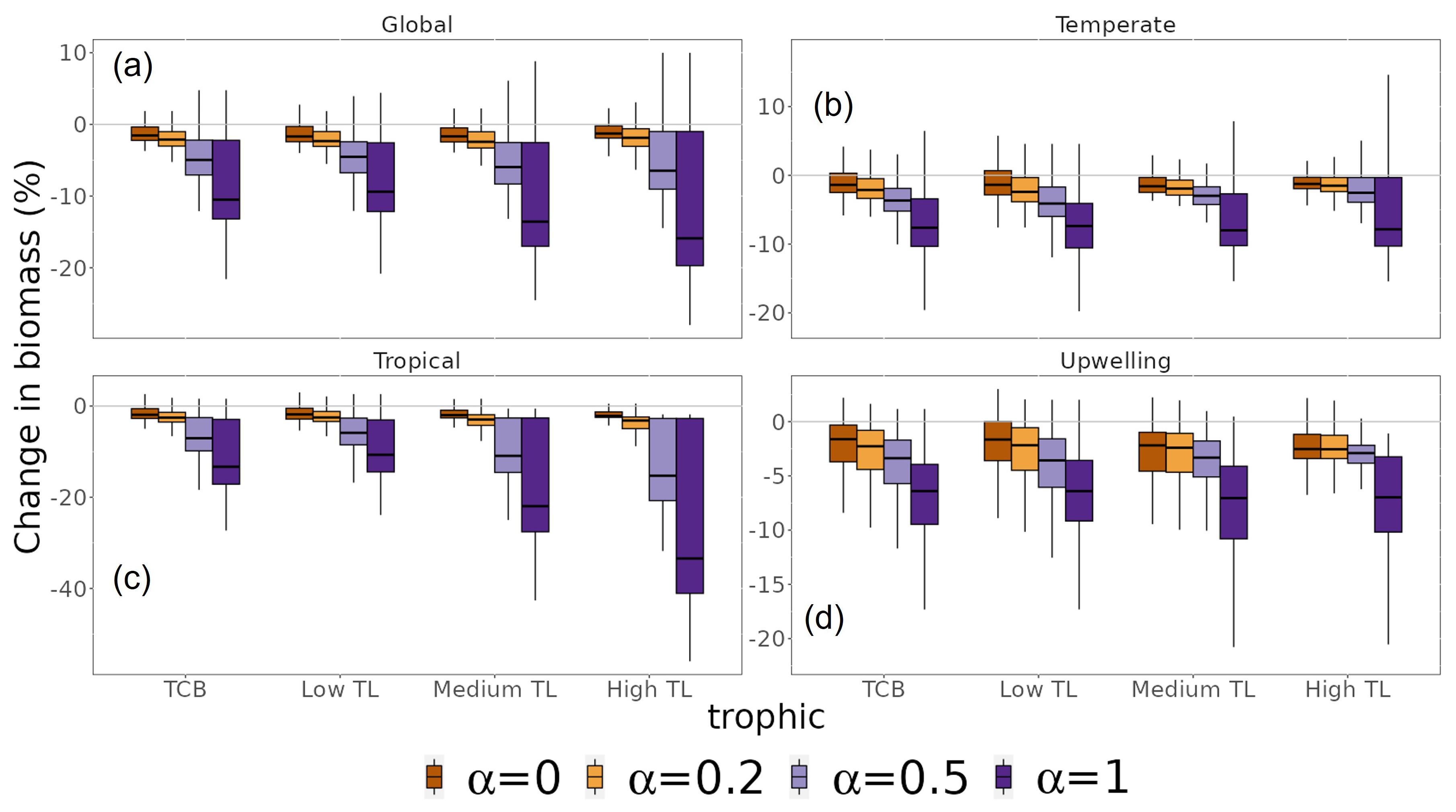 Figure 7Sensitivity of changes in total consumer biomass to different resistance capacity settings. Changes are aggregated for the whole biomass spectrum (TCB) and by trophic level (TL) (low TL, medium TL and high TL). Colours represent different resistance capacity settings (α values): (a) global ocean, (b) temperate biomes, (c) tropical biomes and (d) upwelling biomes. The different horizontal lines of the box plot refer to the median, 25th and 75th quantiles.