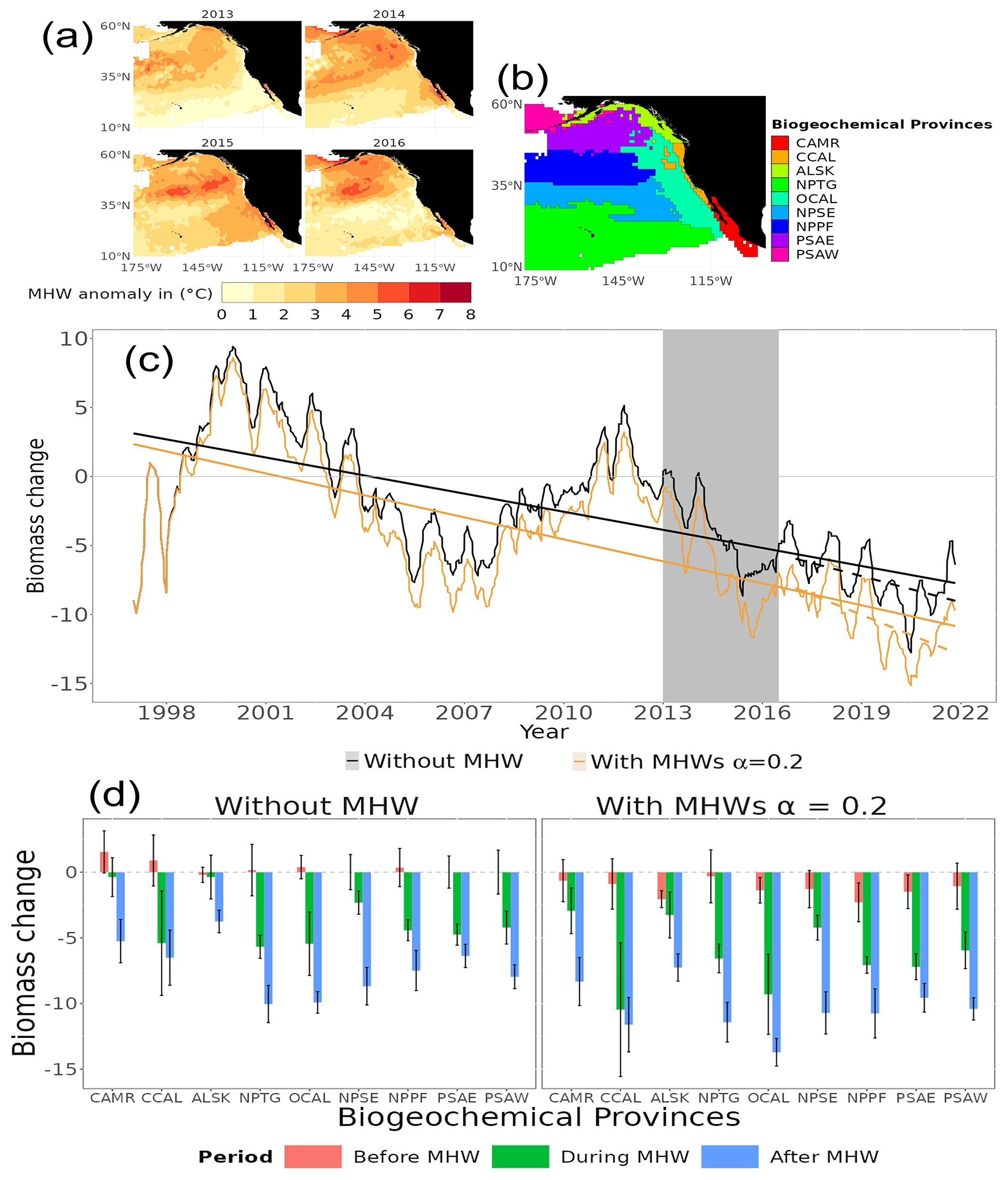 Figure 8Hindcast of temporal and spatial biological impacts of the MHW from 2013 to 2016 in the northeastern Pacific (the Blob). (a) Temperature anomalies between 2013 and 2016. (b) Biogeochemical provinces definition, with Central American coast (CAMR), California ocean and coastal current (OCAL and CCAL), Alaska coastal downwelling (ALSK), North Pacific tropical gyre (NPTG), northeastern Pacific subtropical (NPSE), North Pacific polar front (NPPF), Eastern Pacific subarctic gyres (PSAE) and Western Pacific subarctic gyres (PSAW). (c) Generalised least squares models (lines) and total consumer biomass change in the “without MHW” and “with MHWs” scenarios in the black and light-orange colours, respectively. The vertical grey shaded area indicates the duration of the Blob. (d) Average total consumer biomass changes before (1998–2012 – pink), during (2013–2016 – green), and after (2017–2021 – blue) the Blob for each biogeochemical province. The error bars correspond to standard errors.