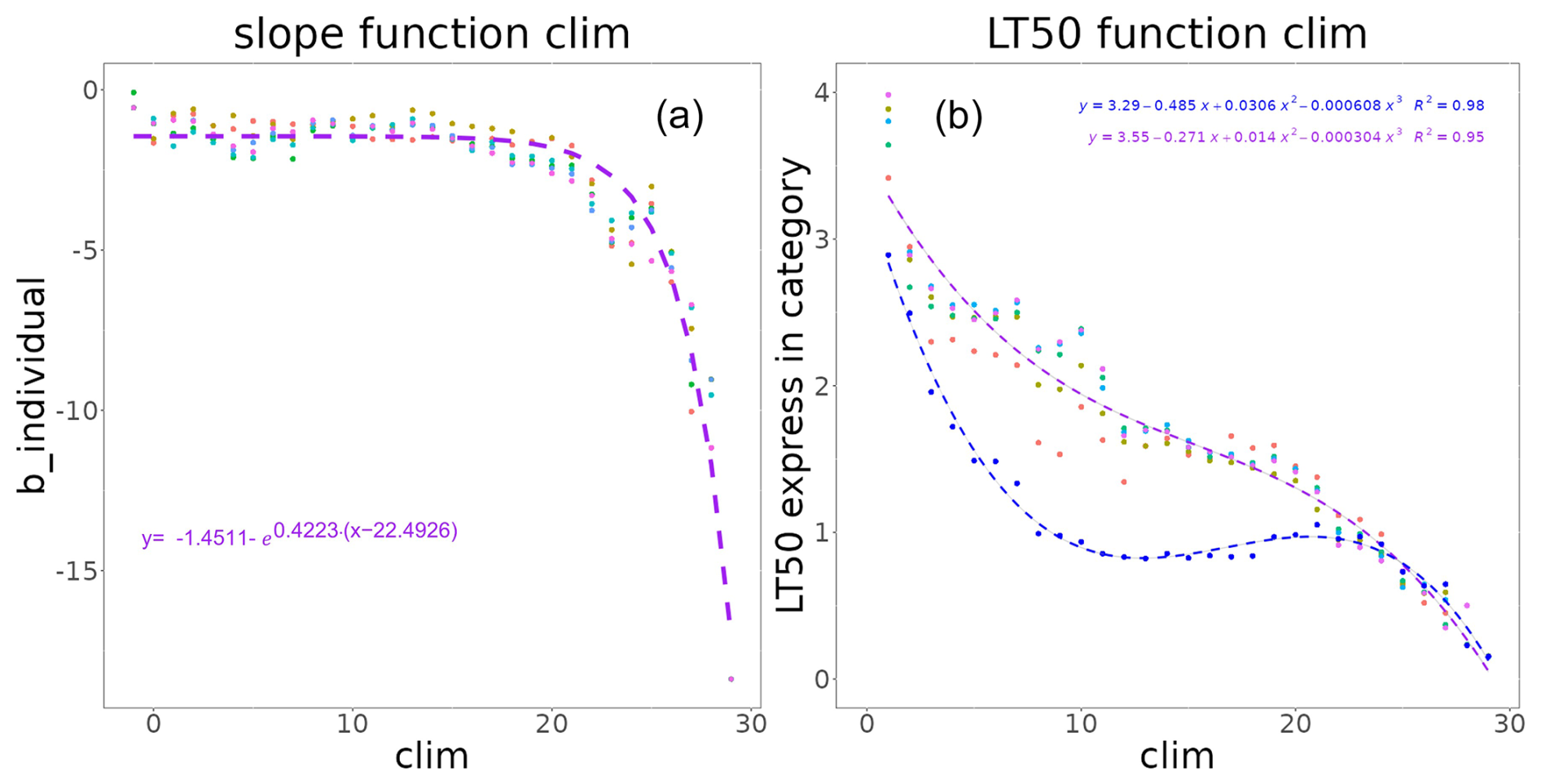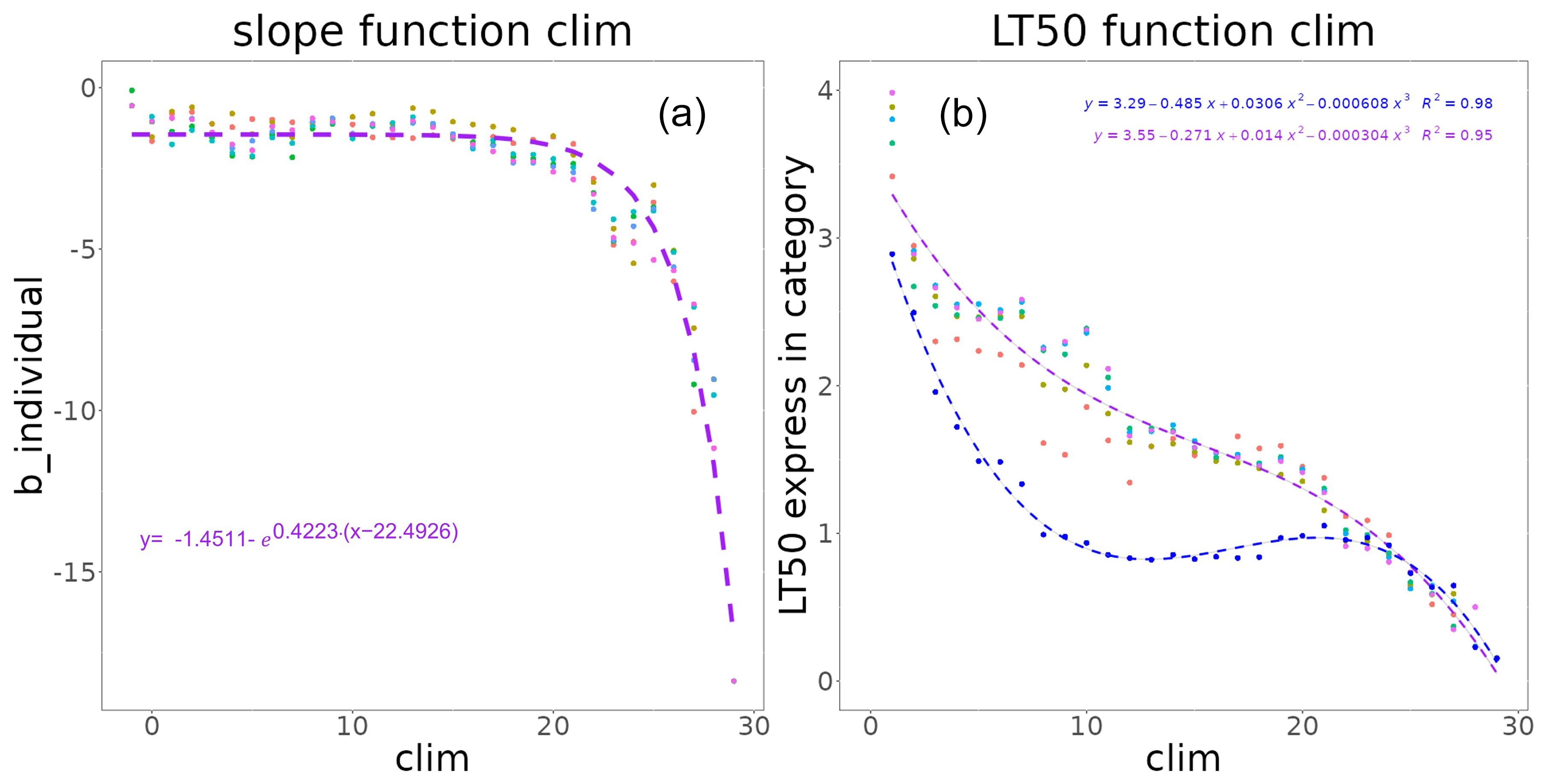 where b_tli and lt50_tli correspond to the slope of the function and the index of marine heatwave intensity (MHWcat,i) at which 50 % of the species undergo thermal stress in celli. β corresponds to the MHW duration, with β ranging from β=0 (no MHW) to β=1 (MHW lasting 15 d) (see Sect. 3.3.1). MHWcat,i corresponds to an MHW intensity index (defined in Appendix A1), and α is a coefficient assumed to represent the species' resistance capacity to MHW conditions, thus reducing the mortality rate due to species' exposure to thermal stress.