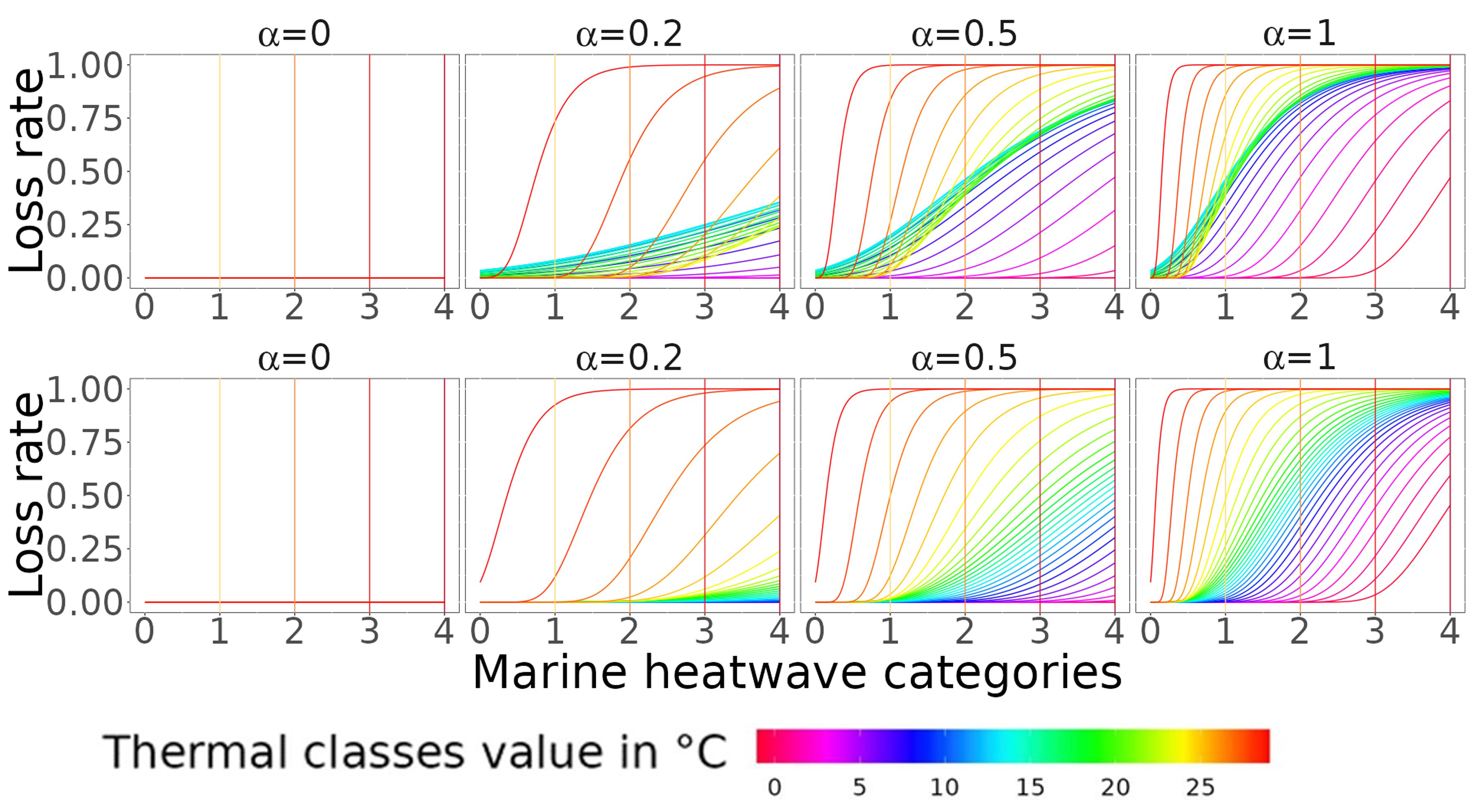 Finally, we assumed in the mathematical expression of loss rate (ηi) that species are continuously challenged by increased MHW intensity, which is expressed as