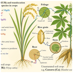 Figure 1Conceptual model summarizing the uptake and translocation processes of different Hg species in both saturated (i.e., rice) and unsaturated (i.e., cassava) soil crops including estimated qualitative rates based on the reviewed literature in Sect. 3.1 and 3.2. Line colours are associated with colours of species listed on the left (i.e., Hg(0) is in light blue). We note that plant and plant tissue art was developed for the purpose of presentation and is based on generic representations; hence, they may differ slightly from reality. Plant and plant tissue images were developed using ChatGPT (OpenAI), but all other parts of the figure (including labels) were constructed by co-authors.