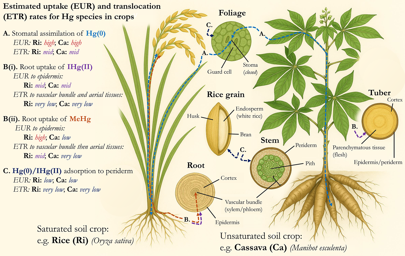 While stomatal assimilation of Hg(0) can and does occur in rice (Oryza sativa L.; Qin et al., 2020; Tang et al., 2021a; Aslam et al., 2022), rice is exceptional in that it also accumulates significant amounts of Hg from the soil, due to the availability of MeHg which is formed in the anaerobic paddy soils (Rothenberg et al., 2014). MeHg represents 40 %–60 % of the THg burden in rice (Rothenberg et al., 2014), which contrasts other crops that usually accumulate only 0.05 %–1 % MeHg even in contaminated areas (Qiu et al., 2008; Sun et al., 2020; Eboigbe et al., 2025). Rice is a staple food crop for >3.5 billion people (Zhao et al., 2020) and, globally, rice represents 10 % of total MeHg intake (Liu et al., 2019), emphasizing the considerable public health concerns posed by the consumption of MeHg and IHg(II) contaminated rice.