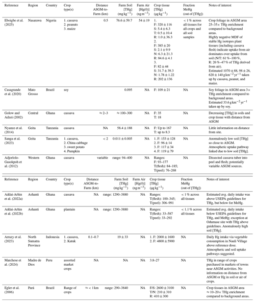 Table 1Information from studies of crops farmed in non-saturated soils in agricultural areas impacted by ASGM activities. Tissue abbreviations: F – foliage; S – stem; R – root; T – tuber/fruit; N – nut. [ ] denotes concentration. NA: data not available.