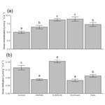 Compared to the control, all treatments showed significantly higher gross N mineralization rates (Fig. 2a). EcM/ErM and Dominant showed the largest increases, at 73 % and 78 % above the Control, respectively, while AM/NM and Rare had more moderate increases of 30 % and 46 %. Gross nitrification rates were 1–2 orders of magnitude lower than gross N mineralization rates (Fig. 2b). Significant differences in gross nitrification rates were also observed, with EcM/ErM showing a 26 % increase, while Rare, AM/NM, and Dominant exhibited reductions of 32 %, 46 %, and 49 %, respectively, compared to the Control (Fig. 2b).