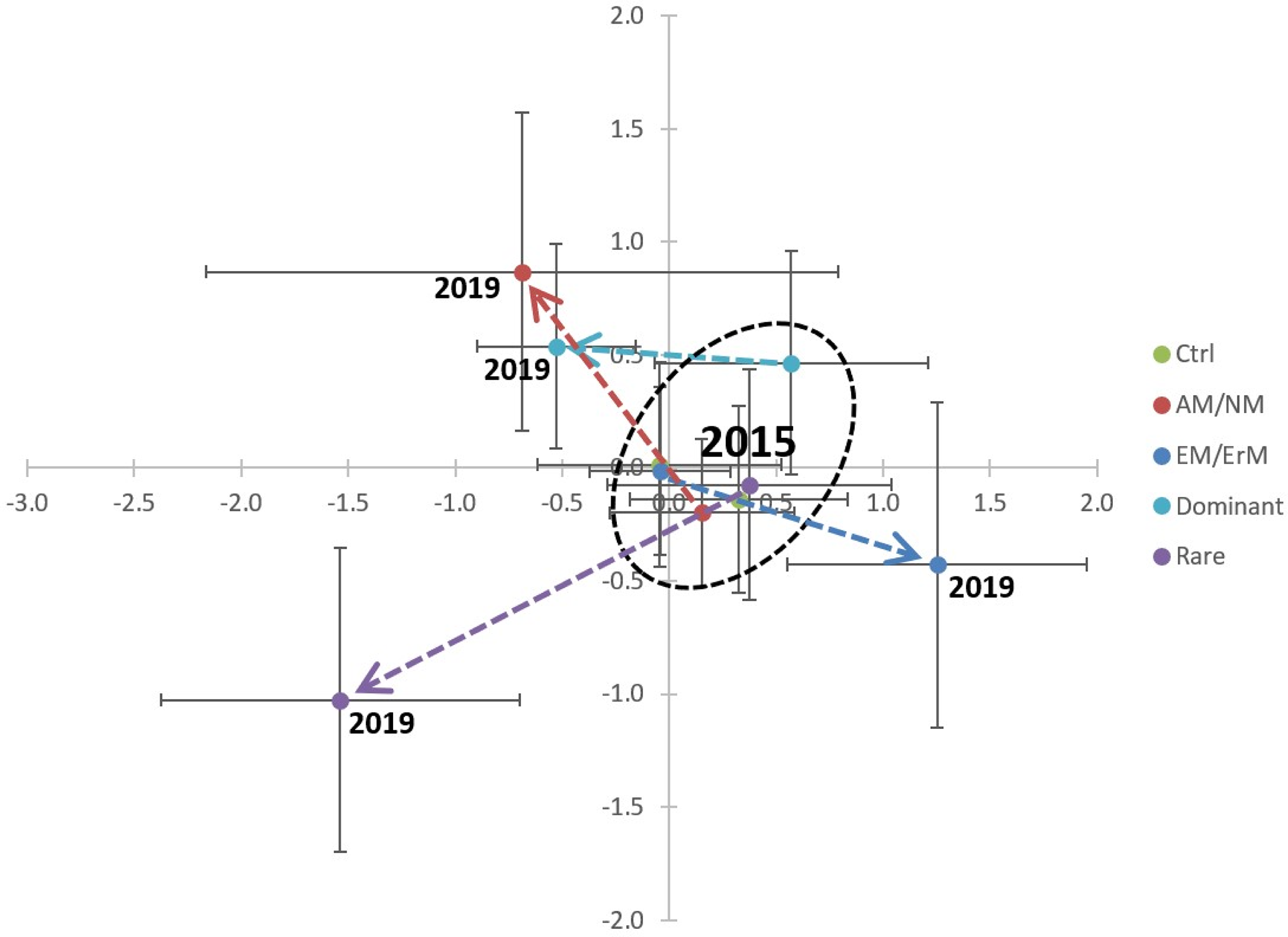 The treatments clearly shifted the plant community in three directions within the ordination space from its original structure in 2015 (Fig. 1). The AM/NM community and the Dominant community clustered together, whereas the EcM/ErM community and the Rare community formed their own distinct clusters after clipping treatment. The control plots in 2019 remained similar to the plant communities recorded in 2015 before the experiment was established.