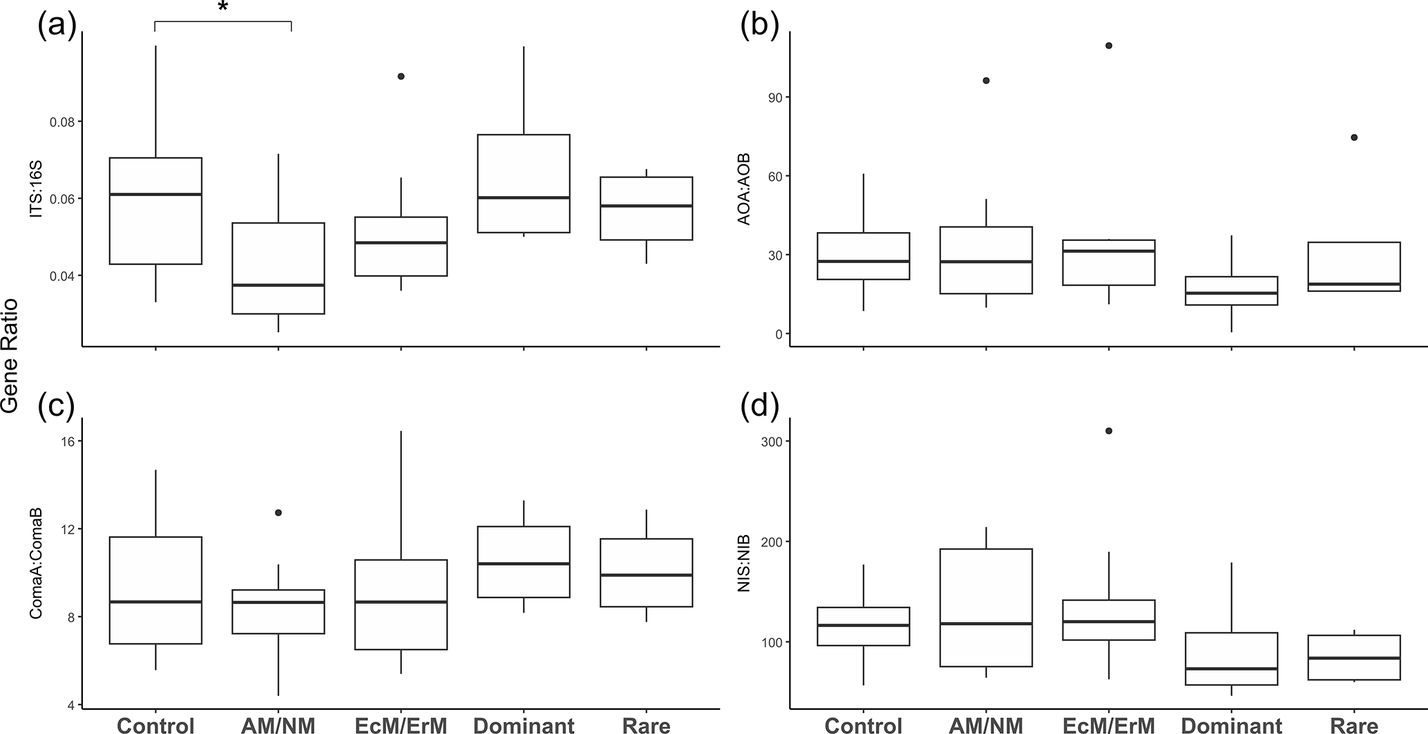 Figure 3Soil gene abundance ratios in response to plant removal treatment. Gene abundance ratios for (a) fungi (ITS) vs. bacteria (16S rRNA gene); (b) Archaeal ammonia oxidizer (AOA) vs. bacterial ammonia oxidizer (AOB); (c) comammox bacteria, clade ComaA vs. comammox clade ComaB; and (d) nitrite-oxidizing Nitropira (NIS) vs. Nitrospira (NIB). Treatments: no manipulation: Control; removal of plants with ecto and ericoid mycorrhiza associations: AM/NM; removal of plants with arbuscular mycorrhiza & no mycorrhiza associations: EcM/ErM; removal of rare plant species: Dominant; removal of dominant plant species: Rare. Symbols above the boxplots denote significant differences for each group relative to a control group as determined through Generalized Linear Mixed Models (GLMMs) (* <0.05) (Table S10).