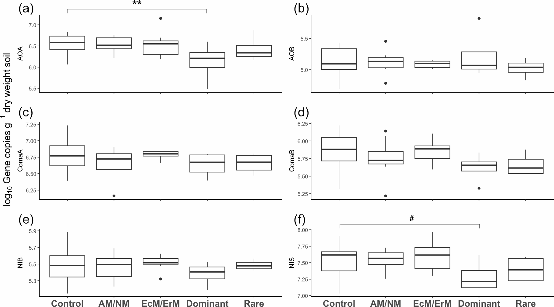 Figure 4Gene abundances representing six functional groups involved in nitrification in response to plant removal treatment. (A) Ammonia-oxidizing archaea (AOA), (B) ammonia-oxidizing bacteria (AOB), (C) complete ammonia oxidizers (comammox) clade A (comaA), (D) complete ammonia oxidizers (comammox) clade B (comaB), (E) nitrite-oxidizing Nitrobacter (NIB), and (F) nitrite-oxidizing Nitrospira (NIS). Treatments: no manipulation (Control); removal of plants with ecto and ericoid mycorrhiza associations: AM/NM; removal of plants with arbuscular mycorrhiza & no mycorrhiza associations: EcM/ErM; removal of rare plant species: Dominant; removal of dominant plant species: Rare. Symbols above the boxplots denote significant differences for each group relative to a control group as determined through Generalized Linear Mixed Models (GLMMs) (** <0.01, #<0.1) (Table S12).