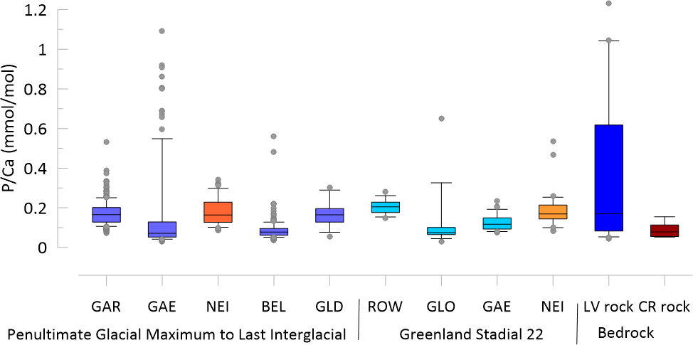 We divide the PGM-LIG datasets into three intervals, the last interglacial (127 to 118 kyr BP), the penultimate deglaciation (135 to 127 kyr BP) and the penultimate glacial (145–135 kyr BP). Among samples from the same interval, there are substantial differences in the mean P/Ca ratios, with BEL and GAE exhibiting lower median P/Ca than GAR or NEI (Fig. 3). These differences are not due to contrasting bedrock P/Ca, since the contrasting BEL and GAE are from samples from the same cave. Although the median P/Ca in bedrock from Cueva Rosa is half that of La Vallina, the stalagmite from Cueva Rosa (NEI) does not feature lower mean P/Ca.