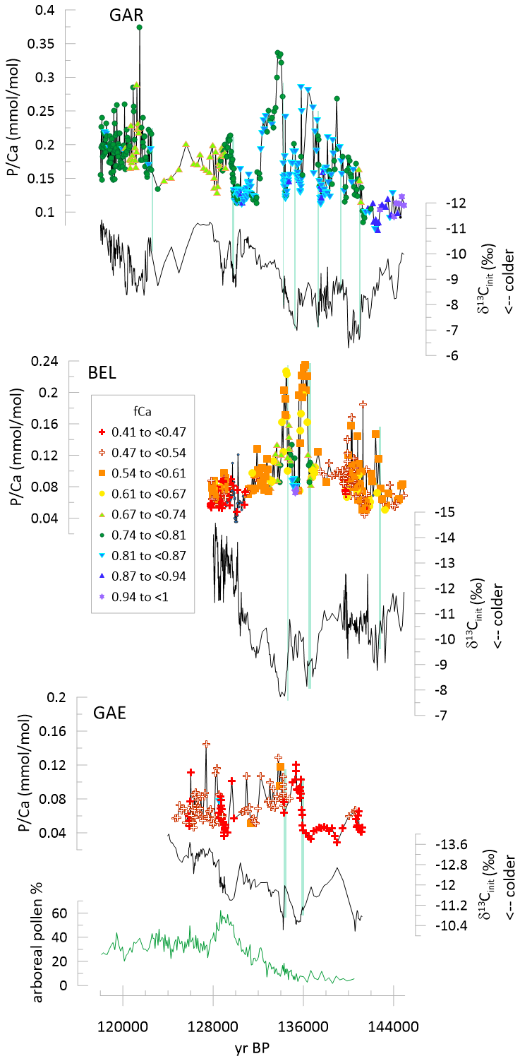 GAR provides the highest resolution and longest record from the penultimate glacial to last interglacial. In GAR, at the onset of a significant stadial cold event manifest in δ13Cinit at 140 ka, P/Ca abruptly increases and decreases at the end of the stadial event (Fig. 5). A series of transient increases occur between 138 and 130 kyr ago, and the onsets of several of them are coincident with the onset of centennial to millennial scale cooling events manifest as positive excursions in δ13Cinit. Comparison of drilled resolution and average P/Ca in 200 years age bins confirms that these trends are not artifacts of changing sample resolution (Fig. S2). The P/Ca decreases at the culmination of the warming at 130 kyr, followed by another transient increase in P/Ca which initiates during a subsequent set of stadial events around 129 ka. P/Ca during the latter part of the last interglacial are highly variable.