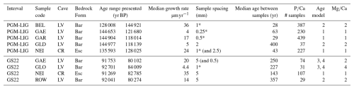 Stalagmite samples were drilled using a Sherline drill which digitally monitors sampling position. Five of the presented stalagmite datasets are based on drilling resolution that continually sampled all of the deposited stalagmite along the growth axis, using drilling resolution of 0.25 to 1 mm per sample (Table 1). These include most of the presented records covering the PGM-LIG and one of the four records covering the GS22. For these samples, each drilled increment typically integrates 30 to 230 years (Table 1). The other presented records sampled 1 mm of powder but at sample increments ranging from 2 to 5 mm, meaning that only 20 % to 50 % of the growth conditions were sampled. The typical interval between samples reflects 150 to 400 years for these datasets (Table 1). During GS22, each drilled sample from GAE, NEI and ROW integrates 30 to 70 years based on the median growth rates. For a 1.5 cm increment in GAE with higher sample resolution of 0.5 mm, this portion of the record has also been downsampled to reflect a constant sample spatial resolution. The impact of variable stalagmite growth rate on the variance in P/Ca is assessed in stalagmite GAR, which features a layer-counted age model from 136 to 128 ka (Fig. S2).