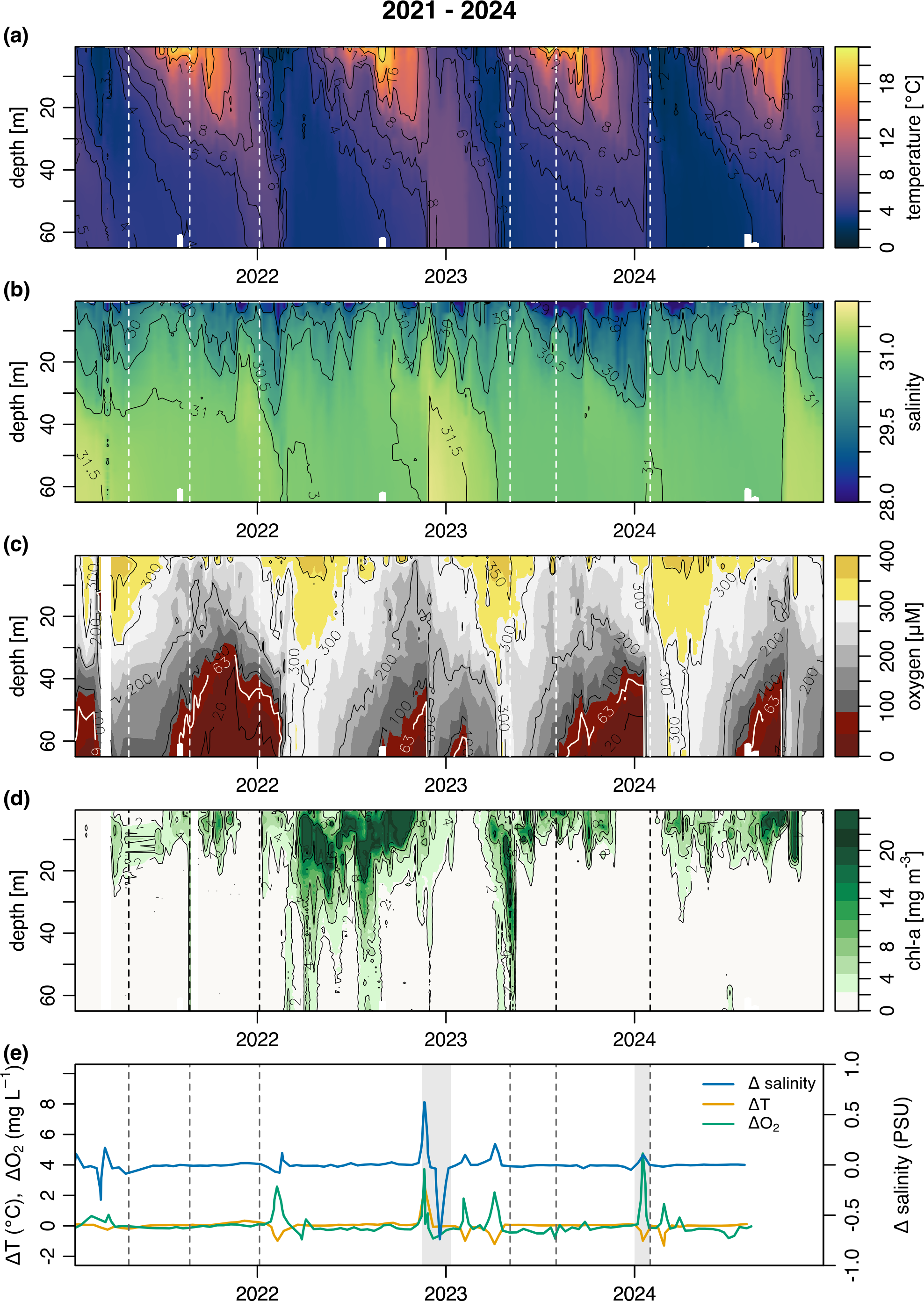 Figure 2Hydrographic conditions in Bedford Basin (Compass Buoy Station) from 2021–2024. Time series of (a) Temperature (°C), (b) Salinity (PSU), (c) Oxygen concentration (µM), (d) Chl a concentration (mg m−3), (e) anomalies of temperature, oxygen concentration and salinity (T, S, O), which trace the intrusion of shelf waters into the basin. A zero anomaly represents no variation between T, S, O between weeks. The grey shaded area represents times likely of an intrusion event. Dashed lines in all panels represent the sampling events in this study.