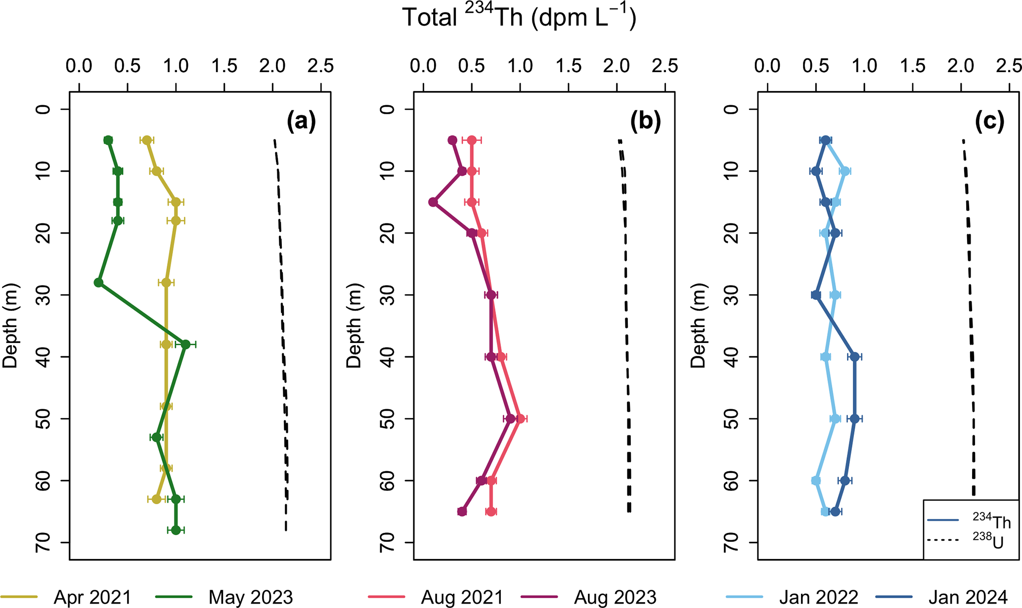 Throughout the water column, 234Thtot activities displayed large deficits (234Thtot=0.1–1.1 dpm L−1) compared to 238U activities (mean = 2.09±0.04 dpm L−1) at all sampling events and all depths (Fig. 3). This indicates that the particle flux in Bedford Basin was large enough in the entire water column to scavenge 234Th prior to its decay. Similar observations have been made in the few other studies from coastal regions (e.g., Luo et al., 2014; Wei and Murray, 1992; Black et al., 2023; Lepore et al., 2007). This contrasts with open ocean sites where 234Th deficits are typically restricted to the euphotic zone (Owens et al., 2015). Generally, in each season, consistency is seen between years, with some variation that could be due to differences in bloom timing, productivity, etc. The largest deficit, with 234Th activities as low as 0.1 dpm L−1, occurred during the large bloom event in May 2023 (Fig. 2d), suggesting enhanced scavenging during this time. Winter profiles (Fig. 3c) are more uniform with depth compared to spring and summer, and despite low productivity during these times (Fig. 2d), still show a pronounced deficit throughout the entire water column.