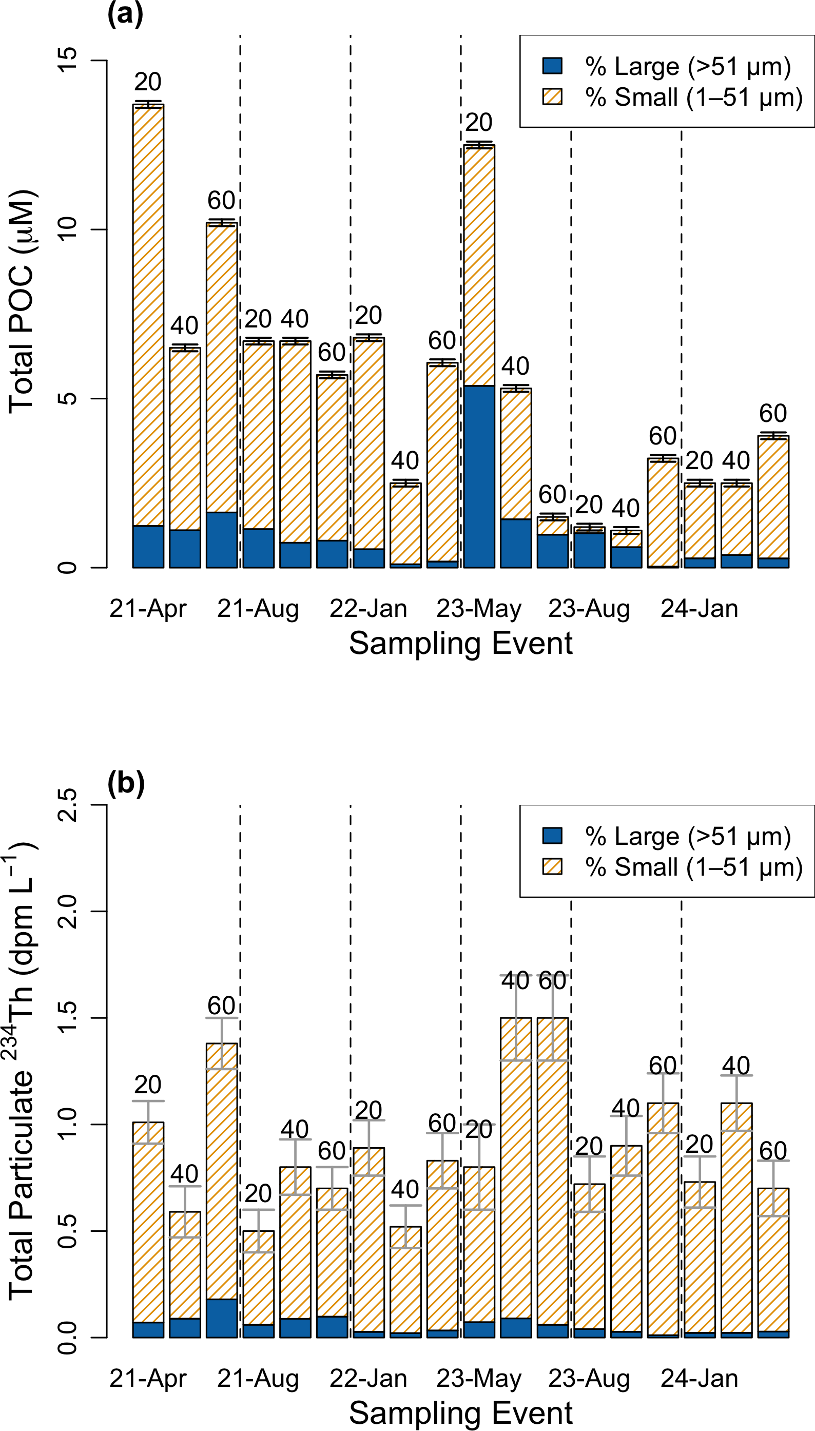 Figure 4Size-fractionated (1–51, >51 µm) pools of (a) particulate organic carbon (µM) and (b) total particulate 234Th (dpm L−1) at approximately 20, 40, and 60 m for each sampling event. Bars are stacked and totals equal the sum of the small and large fractions (legend shows % contribution by size class). Numbers above bars indicate approximate sampling depth. Dashed lines separate events. The small fraction generally dominates both POC and 234Th.
