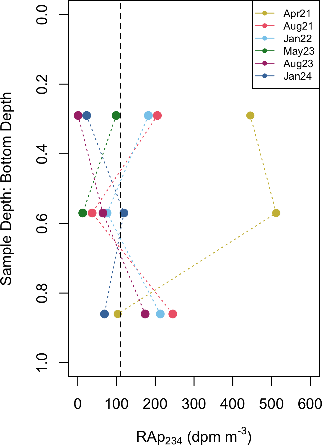 Figure 9Profiles of the total residual activity of particulate 234Th (RaP234) at the Compass Station vs. normalized depth calculated as sample depth divided by total water depth (0 = surface, 1 = bottom). RaP234 values represent the sum of residual counts from both size fractions. Only RaP234 signals above the detection limit were found on the small particulate fraction. The dashed vertical line is the detection limit (derived from filter blank analyses).