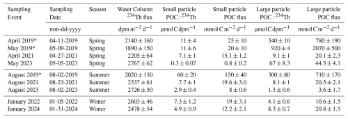Table 1Water column 234Th cumulative fluxes measured at the bottom of the Bedford Basin (60–65 m). Water column 234Th fluxes are multiplied by the POC : 234Th ratios measured on small and large particles to derive POC fluxes with a steady state model. Note that the sampling events with an asterisk (*) represent data from a pilot study in 2019 (Black et al., 2023).