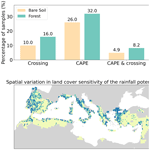 Furthermore, our results suggest that the conditions of the free atmosphere may affect where forestation efforts contribute to convective rainfall potential; these conditions vary across space. The climatic “see-saw” that has been observed in the Mediterranean Basin (Roberts et al., 2012) may explain why the atmospheric conditions in the western and northern parts of the basin seem to be more favorable to trigger convective rainfall potential over forests than the conditions in the east and south. Furthermore, forests mainly seem to contribute to a convective rainfall potential in grid cells adjacent to those already exhibiting significant convective rainfall potential over bare soil, likely because the atmospheric conditions in these areas are favorable for convective rainfall potential.