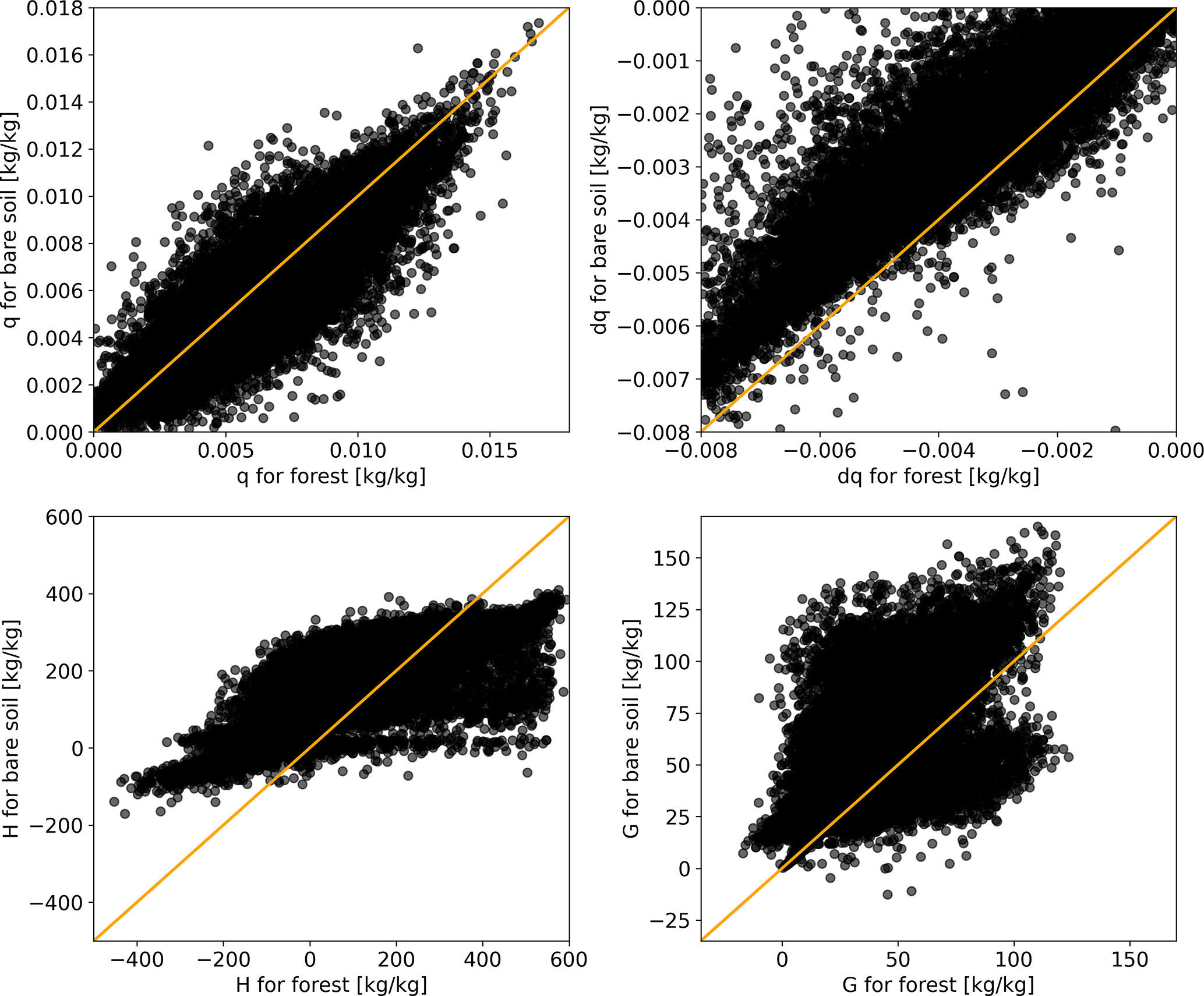 Table A3The mean, median, and standard deviation of different variables for the bare soil validation samples and the forest validation samples. For temperature we take the potential temperature from CLASS and the temperature at 2 m from ERA5. Following an ideal temperature profile, in the surface layer of the ABL the potential temperature is lower than in the mixed layer. It is not possible to make a comparison between bare soil and forest as these values are obtained for different locations.