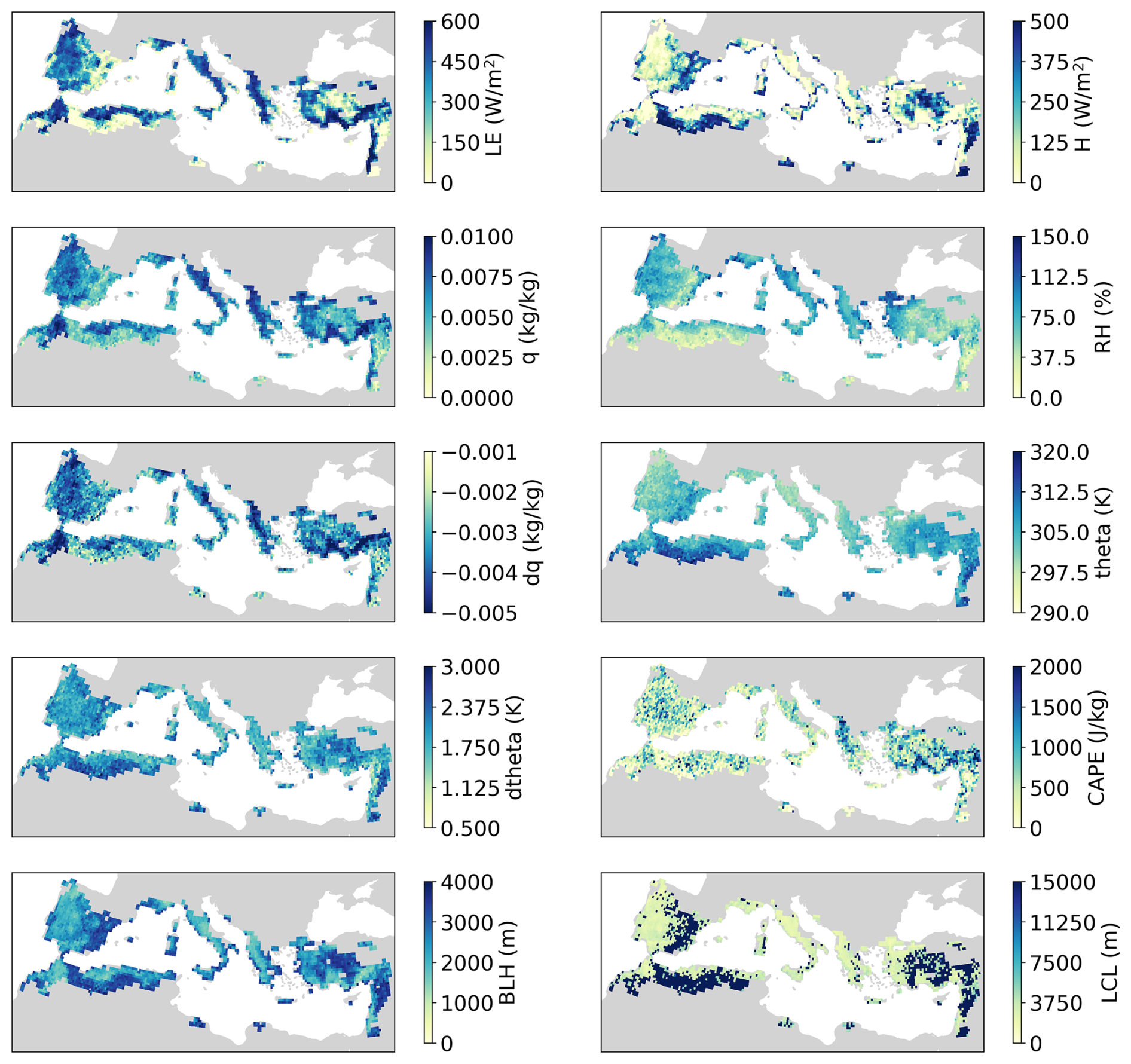 Due to the large number of days and grid cells in the study period and region we designed a specific sampling method for our input data that ensures a distribution that represents the entire Mediterranean Basin during this period. As the main aim of this study is to understand where in the Mediterranean Basin a forest may contribute to local rainfall we are mainly interested in spatial patterns in ABL development, and therefore, sample over the entire study region. The entire region is divided in 2868 grid cells of 0.25° × 0.25°. We decided to analyze the rainfall potential during the months May and June over a 10-year period (2013–2022). To obtain statistically significant results we conduct 20 runs per grid cell. To equally divide these runs over the 10-year study period we randomly select two days for each year. We study a 10-year period rather than a 30-year period to prevent an off-set in the model output due to a warming trend. The sampling resulted in a total amount of 57 360 samples. For each of these samples we ran the model using the specific input data for that location and day, resulting in a total of 20 model runs for each grid cell. The results are calculated including all samples after filtering (see Sect. 2.6). For the analyses on spatial variation, all samples per grid cell are used.