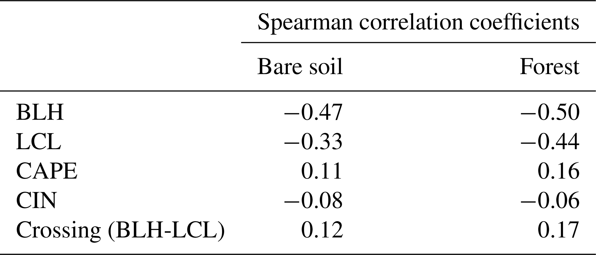 Table A5Spearman rank correlation between soil moisture and various atmospheric variables for the bare soil and forest scenarios.