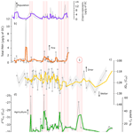 Figure 2(a) Coprostanol concentrations normalised to organic carbon (µg g−1 of OC), with raw data in grey and the purple line represents a 100-year moving average; (b) Total PAH in grey with the red line a moving average (µg g−1 of OC); δDlw of C29 n-alkanes in grey and yellow a moving average (‰); and (d) δ13Clw of C29 n-alkanes in grey with moving average in green (‰) with % C4 plants from a mixing model. For δDlw and δ13Clw (c, d) the grey envelope is the pooled standard error. Note that not all samples analysed for δ13Clw could be analysed for δDlw. 5 “events” have been identified based on peaks that deviate from the baseline record as well as peaks that co-occur across different proxies and are shown as pink bars. Maya time periods are shown below. TC: Terminal Classic; LC: Late Classic; EC: Early Classic; TP: Terminal Preclassic; LP: Late Preclassic; MP: Middle Preclassic; EP: Early Preclassic.