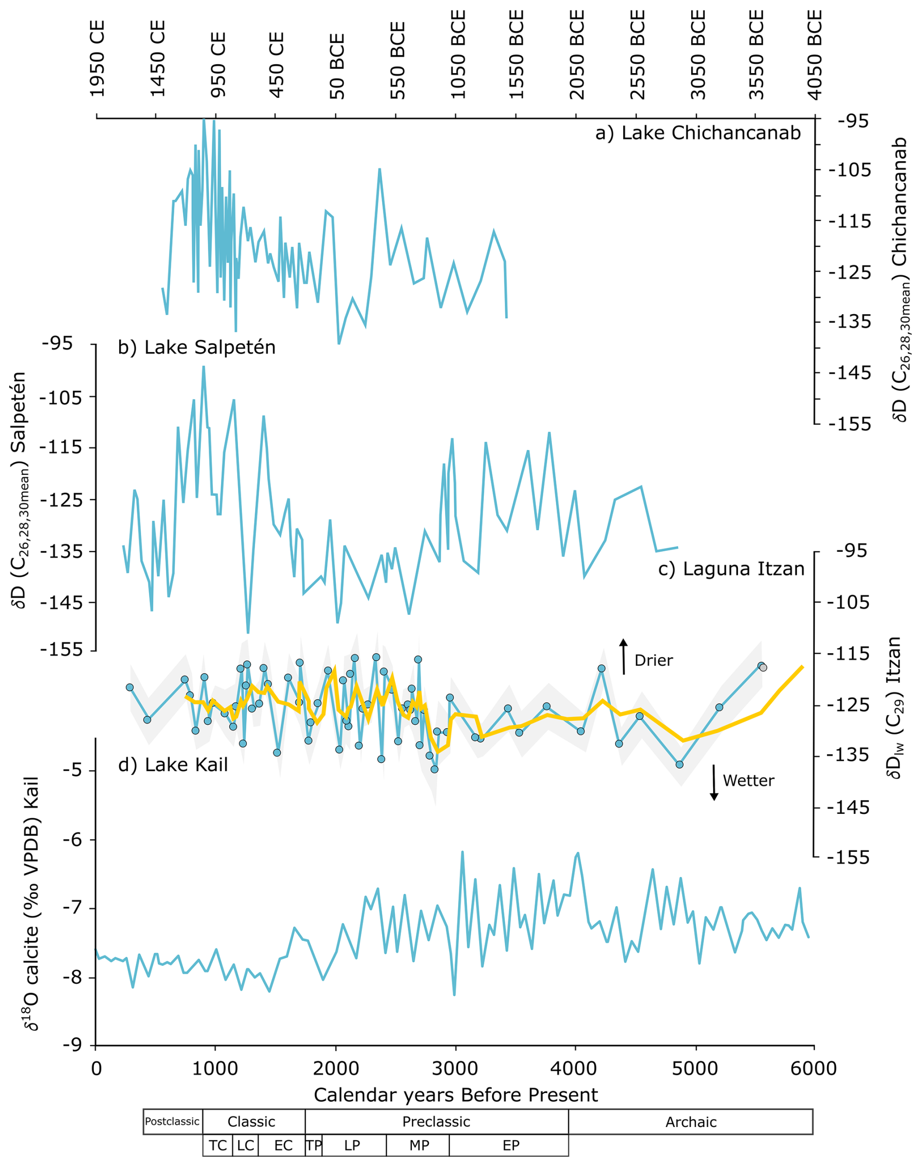 Figure 3δDlw (‰) of leaf wax n-alkane records as proxies for palaeohydrological change moving southwards from (a) Lake Chichancanab; to (b) Lake Salpetén; to (c) Laguna Itzan; to (d) Lake Kail. Maya time periods are shown below. TC: Terminal Classic; LC: Late Classic; EC: Early Classic; TP: Terminal Preclassic; LP: Late Preclassic; MP: Middle Preclassic; EP: Early Preclassic. For Itzan (c) raw data is in blue and the yellow represents a 100-year moving average. The grey envelope is the pooled standard error.