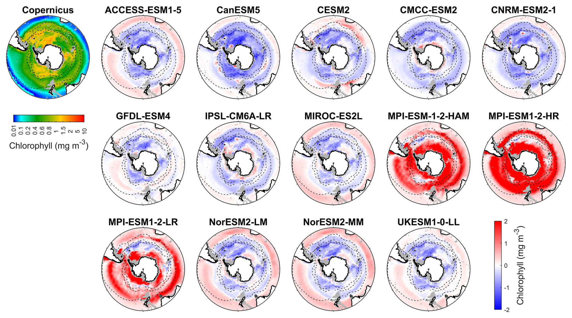 Figure 1Observed surface chlorophyll concentrations from Copernicus in DJF and spatial biases of surface chlorophyll concentrations for 14 CMIP6 models (model chlorophyll – Copernicus chlorophyll) in DJF for the Southern Ocean (>30° S). Black dashed lines in the maps denote the subtropical front, the subantarctic front, and the polar front, from north to south. Grey areas denote regions where no data are available.