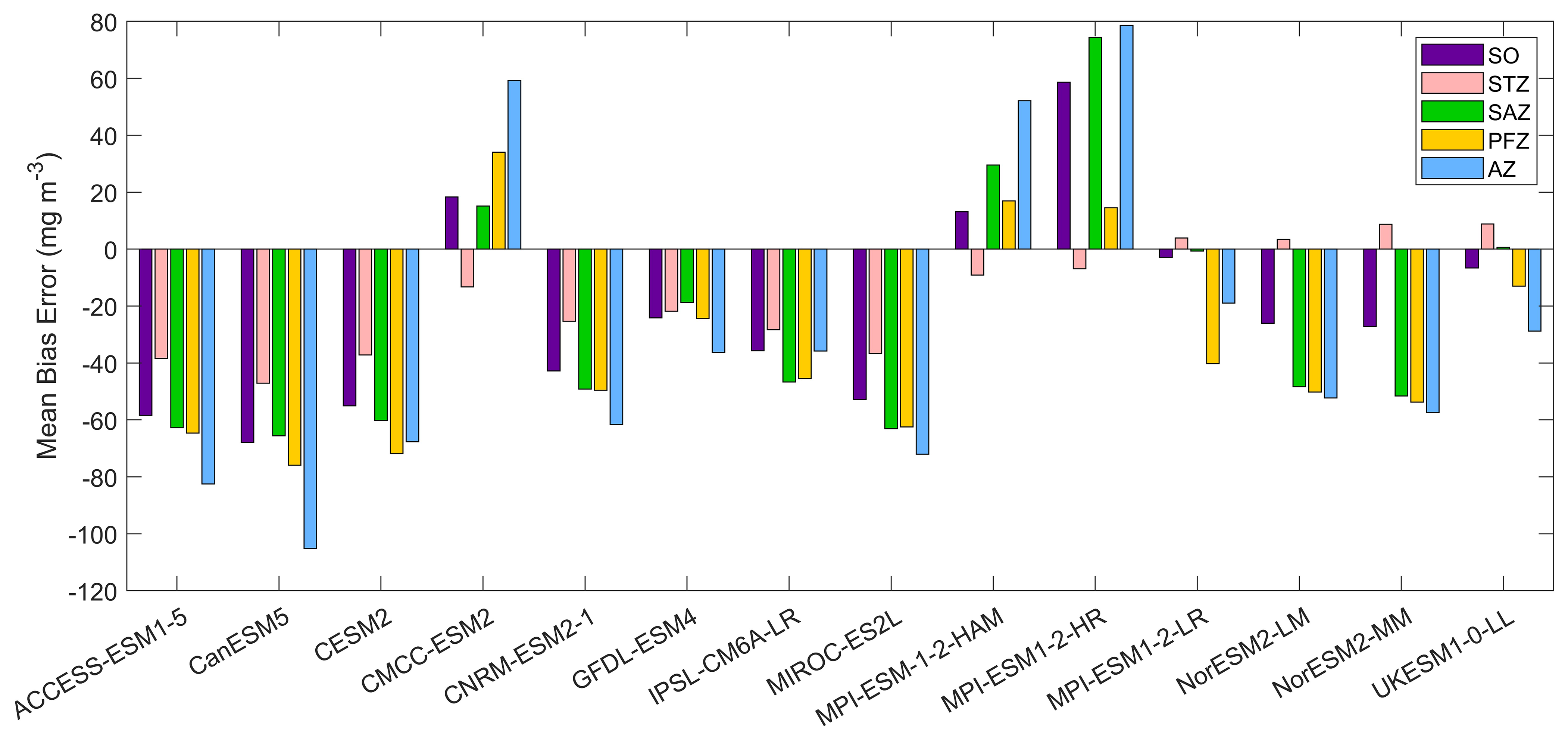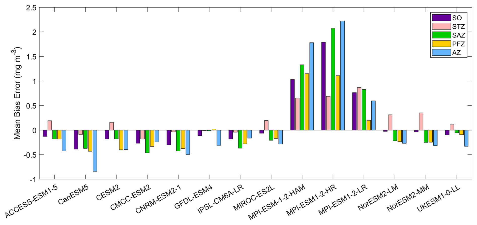 Figure 2The mean bias errors in surface chlorophyll concentrations for the Southern Ocean (SO), the subtropical zone (STZ), the subantarctic zone (SAZ), the polar front zone (PFZ), and the Antarctic zone (AZ) in DJF. All MBEs and means in each region are calculated using area-weighted averages.