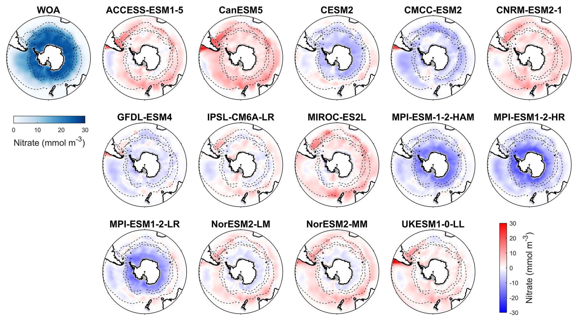 Figure 3Observed surface nitrate concentrations from WOA in DJF and spatial biases of surface nitrate concentrations for 14 CMIP6 models (model nitrate – WOA nitrate) in DJF for the Southern Ocean (>30° S).